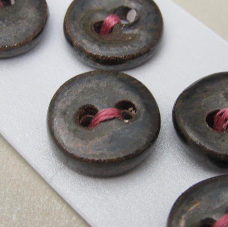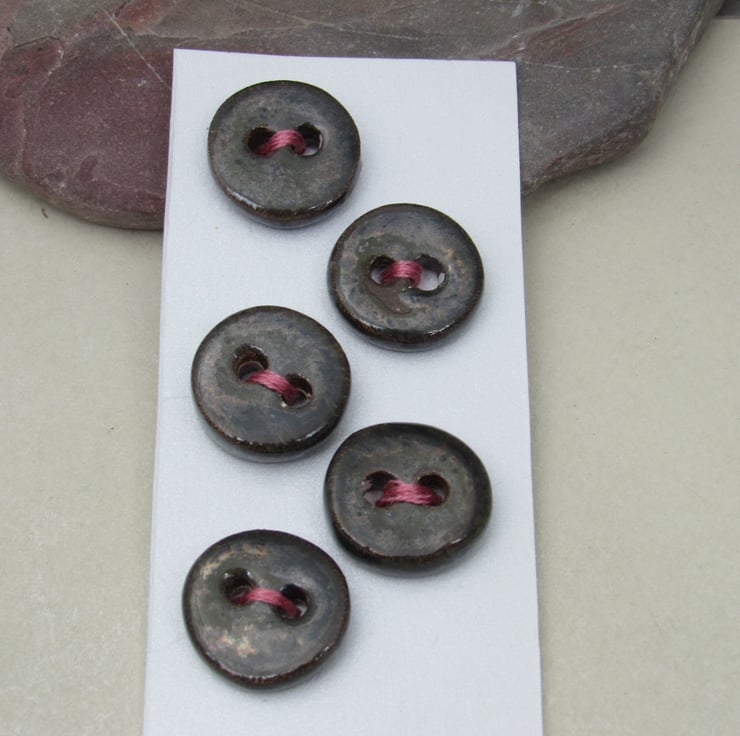 5 small stoneware buttons finished with a dark brown speckled glaze