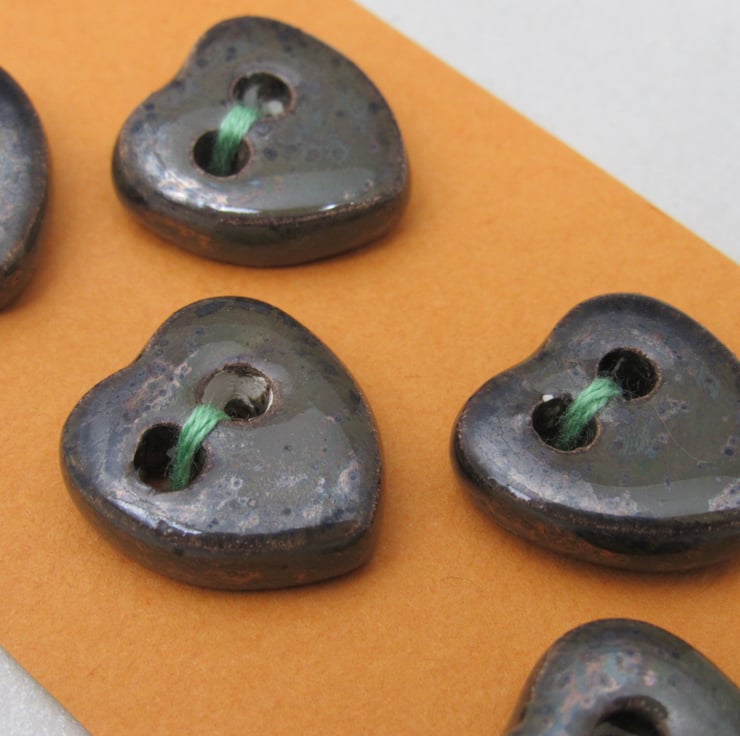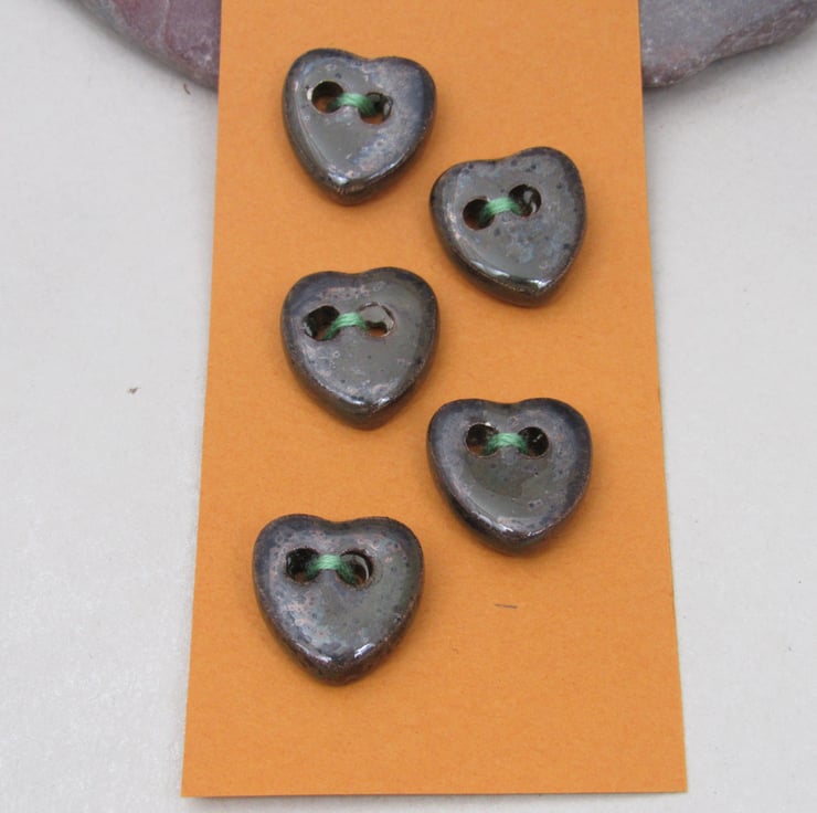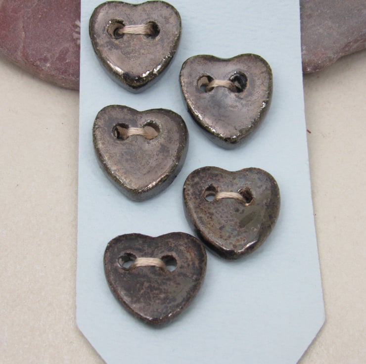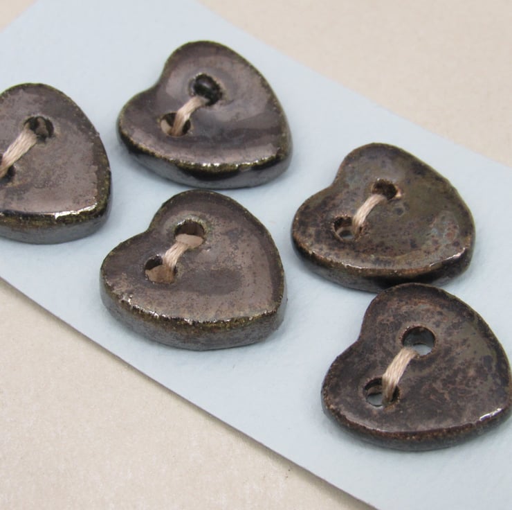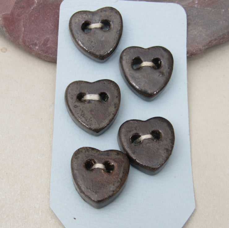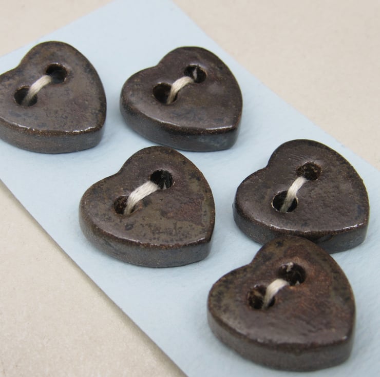 5 small stoneware heart buttons finished with a dark brown speckled glaze.
