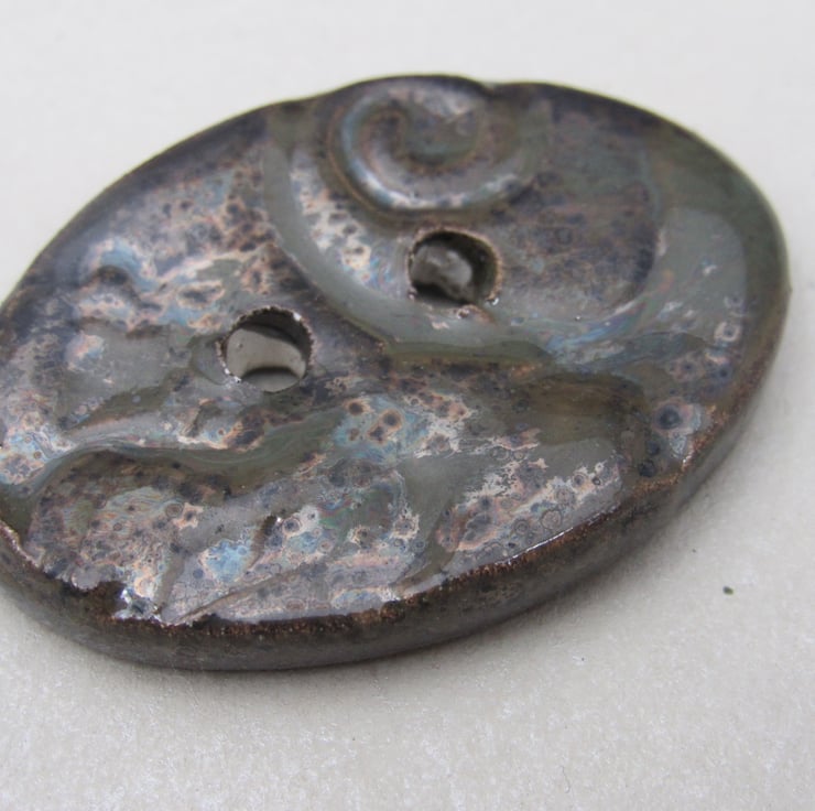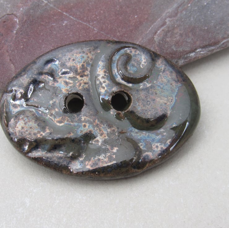 Medium oval shaped stoneware button, textured with a pretty brocade motif.