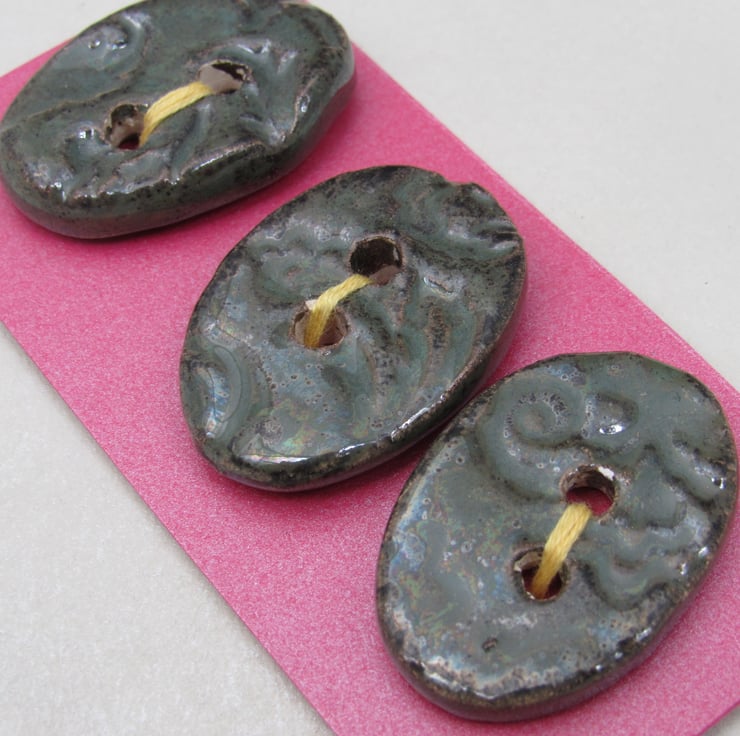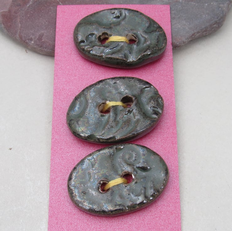 3 medium sized stoneware buttons, with a pretty brocade motif printed into the upper face. Finished with a dark brown speckled glaze.