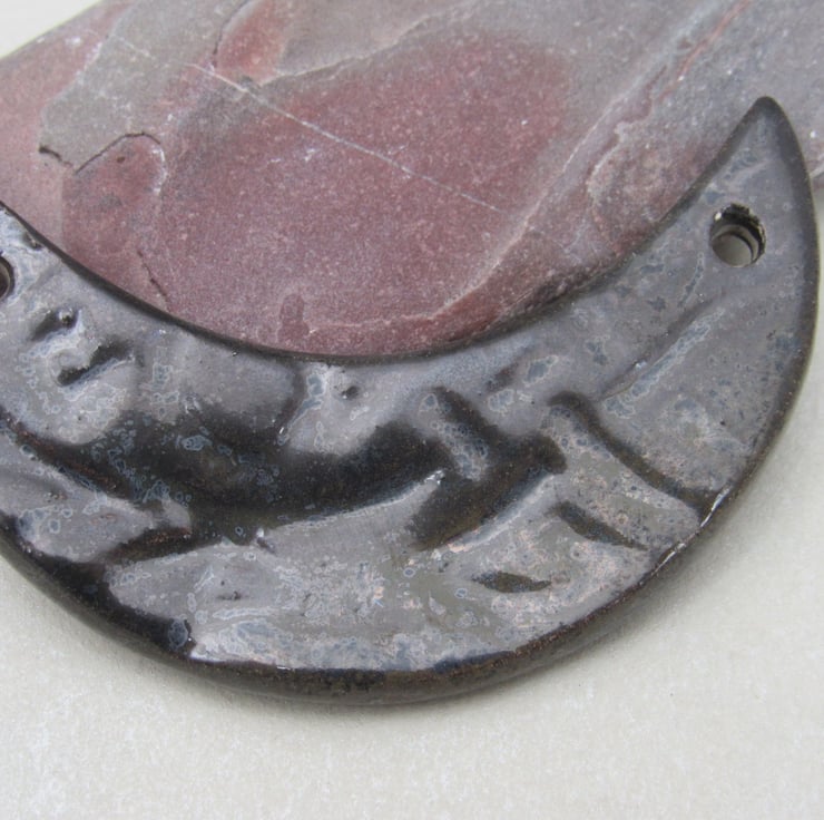 Stoneware ceramic bib pendant patterned with celtic knotwork.