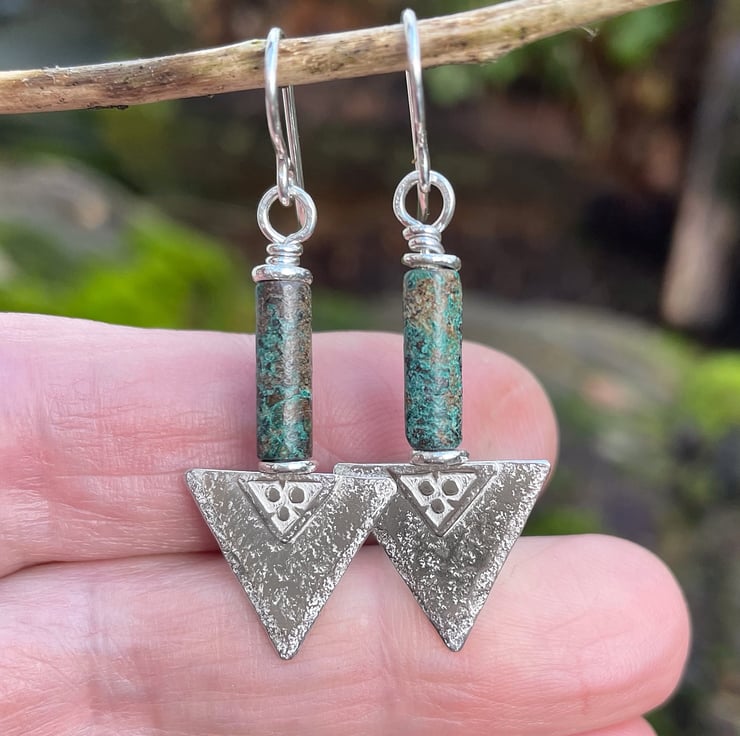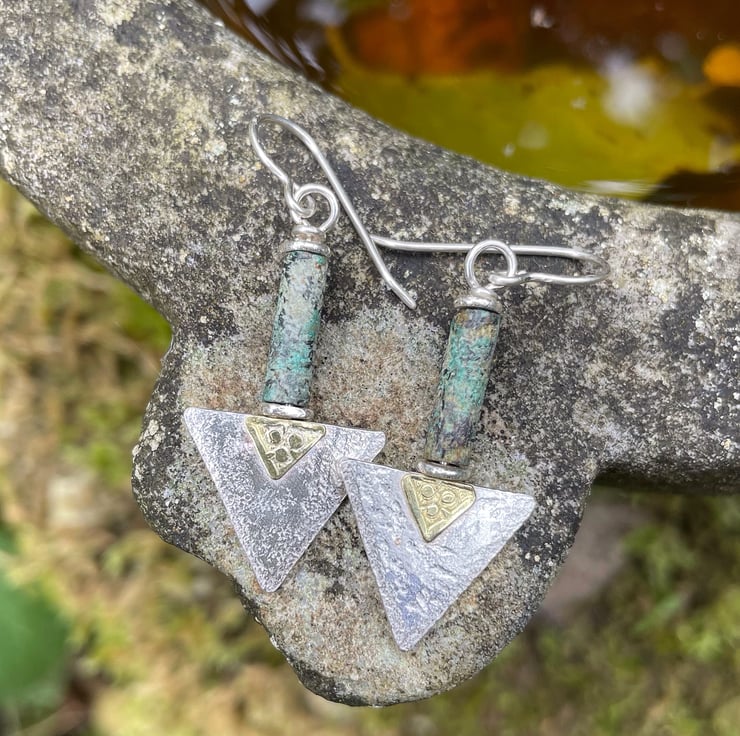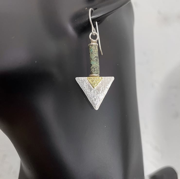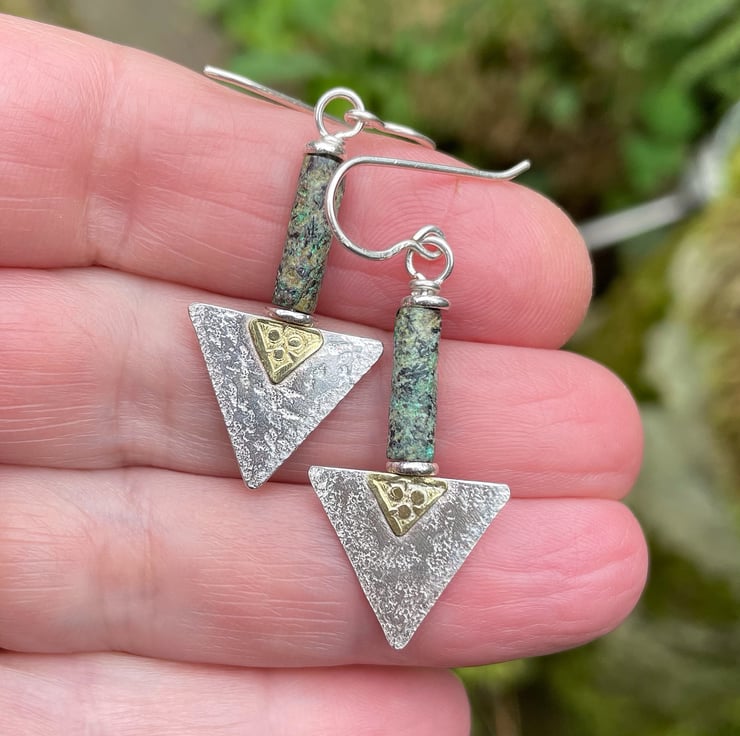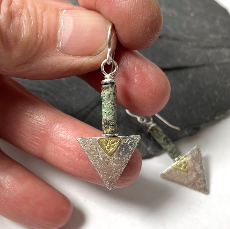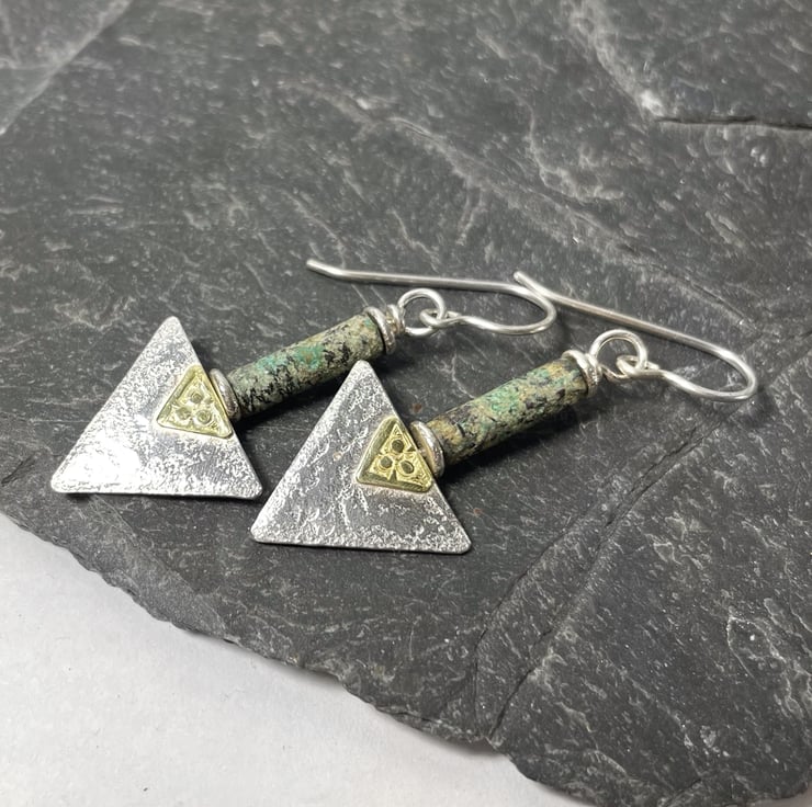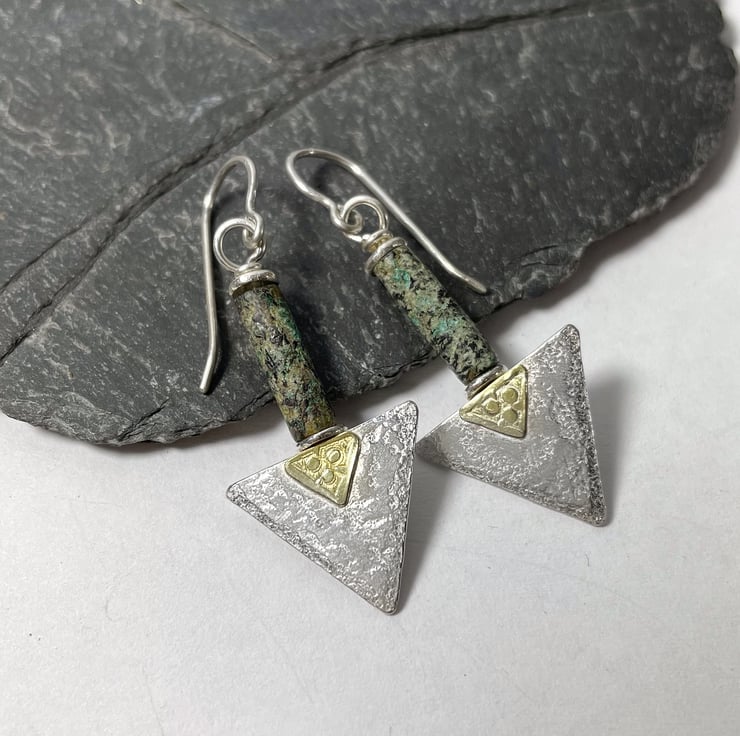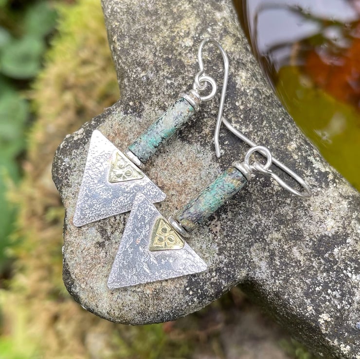 These earrings have a sterling silver triangle with a decorative 18ct gold trefoil type feature panel below a long greeny teal tube bead.
