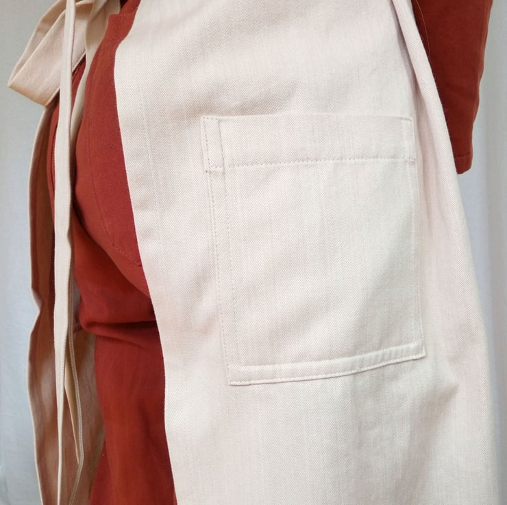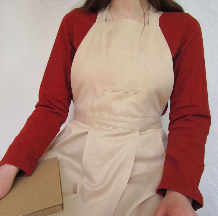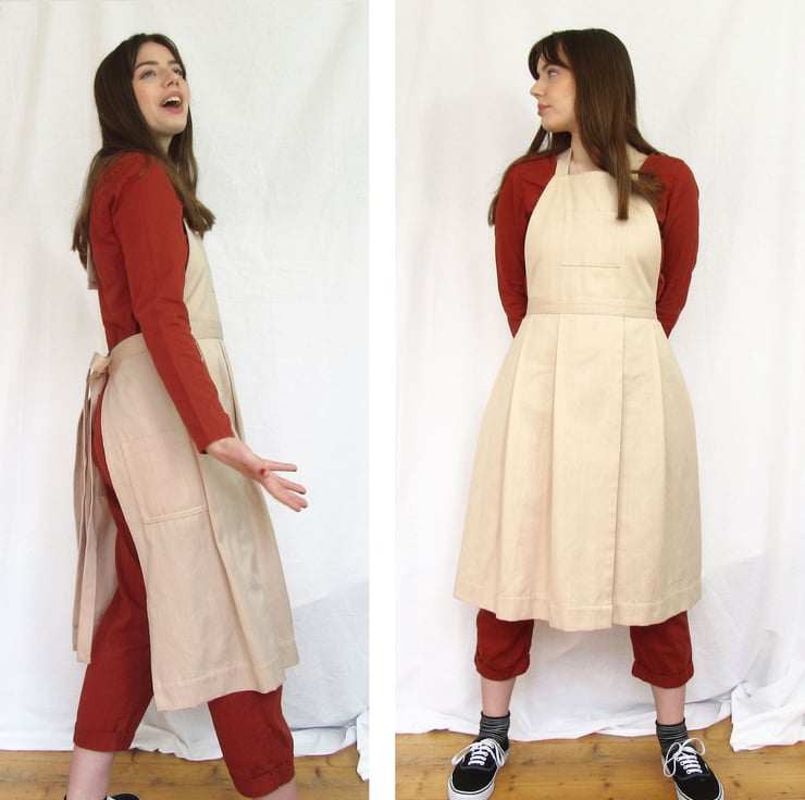This No14:2 design came about after feedback from various makers who prefer a more 'secure-fit' apron, but still needed ease of movement for their legs. The solution was a tie waistband and neck ties with a generously pleated skirt, later a split leg feature was added to the design. It has been a really popular design partly I think because it is such an attractive as well as functional style.
