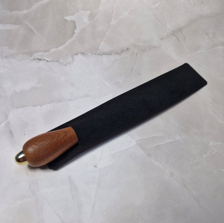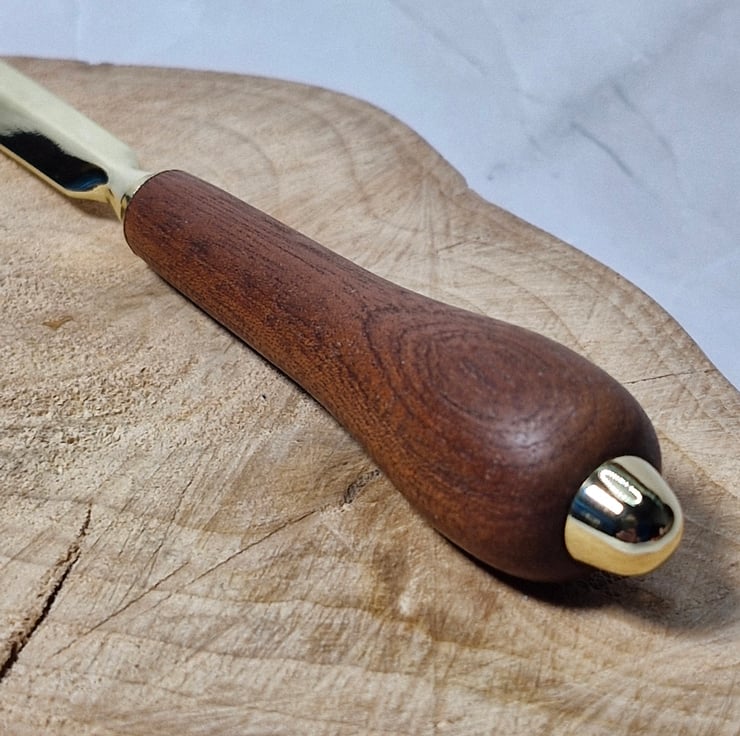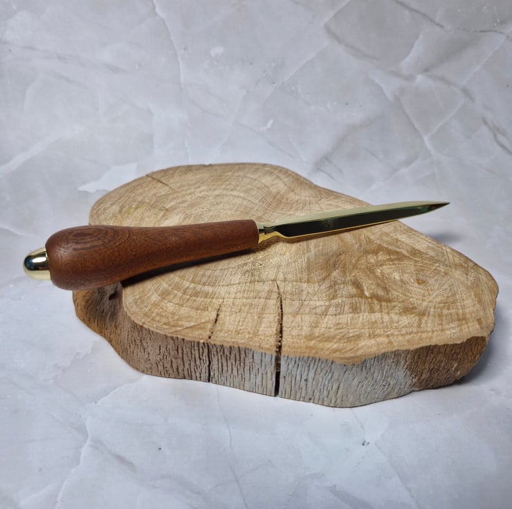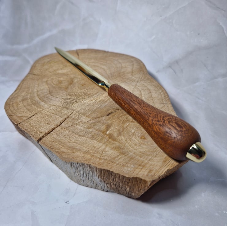 This sleek letter opener has been hand turned in my workshop in Aberdeenshire, Scotland. It has a Meranti handle with gold plated fittings.