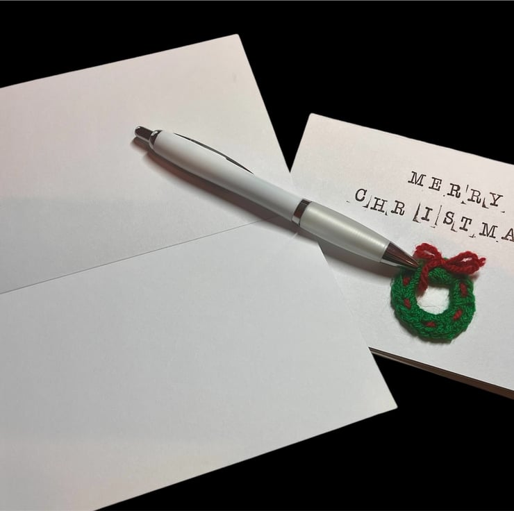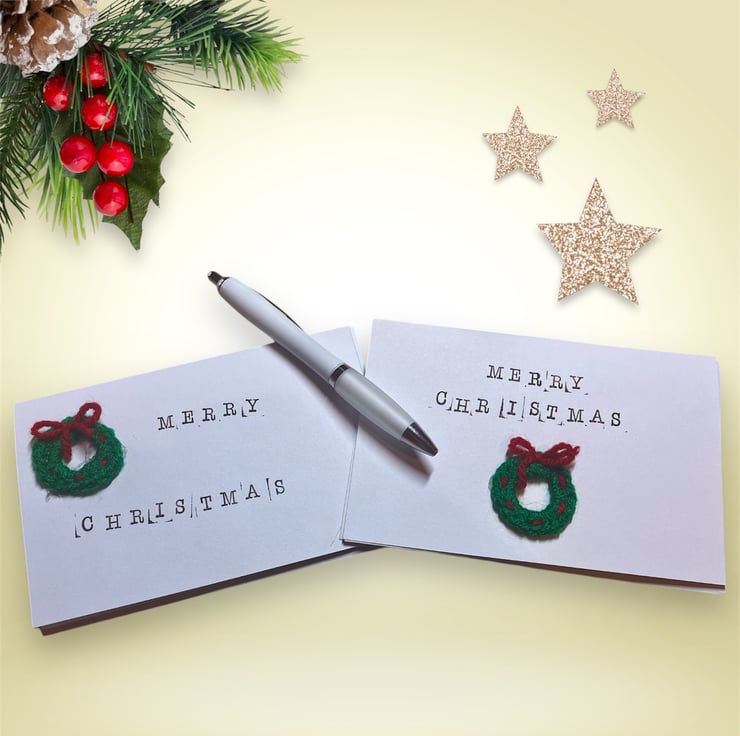 The sweet little crocheted wreath Christmas Cards will stand out in any Christmas Card display.