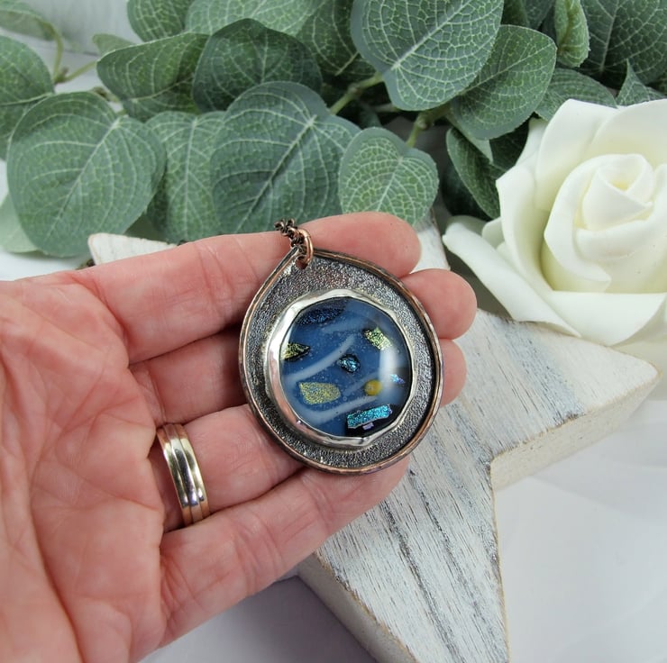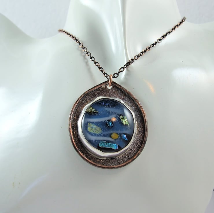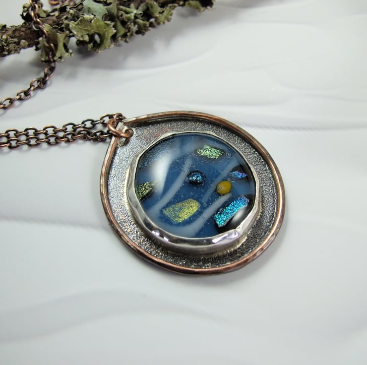 I made the dichroic and blue glass cabachon by layering different glass together and then kiln firing where the glass reaches melting point and forms an organic domed shape. This process takes around 7 hours. Once the glass was ready I designed the copper bezel fitting and made it to fit the organic cabachon perfectly using copper sheet and white metal wire for added contrast.