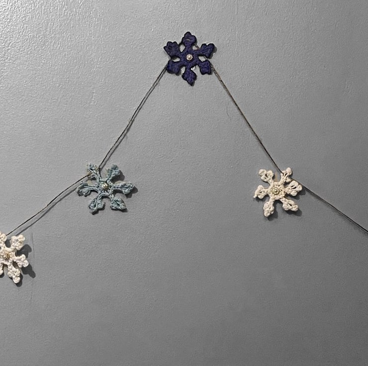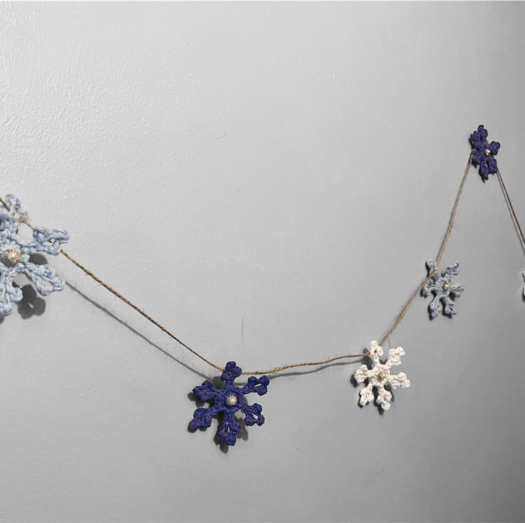 Each of the 9 crocheted snowflakes are embellished with a rhinestone and faux pearl centre that adds a bit of sparkle to this cottage core Christmas bunting.