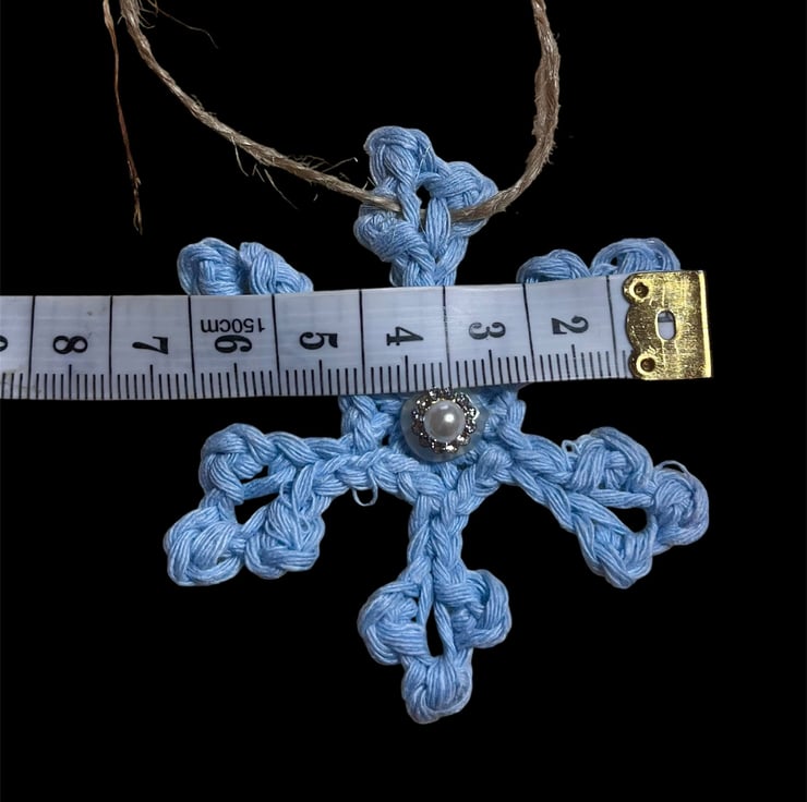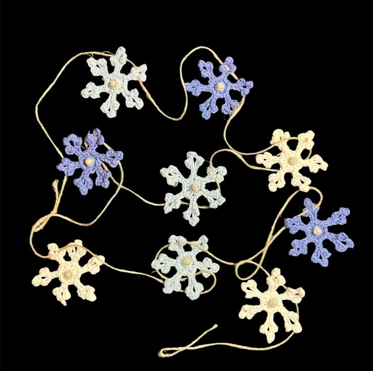 This snowflake decoration is approximately 2m long on rustic twine. Each 7 cm snowflake is adjustable by a simple sliding along the twine.