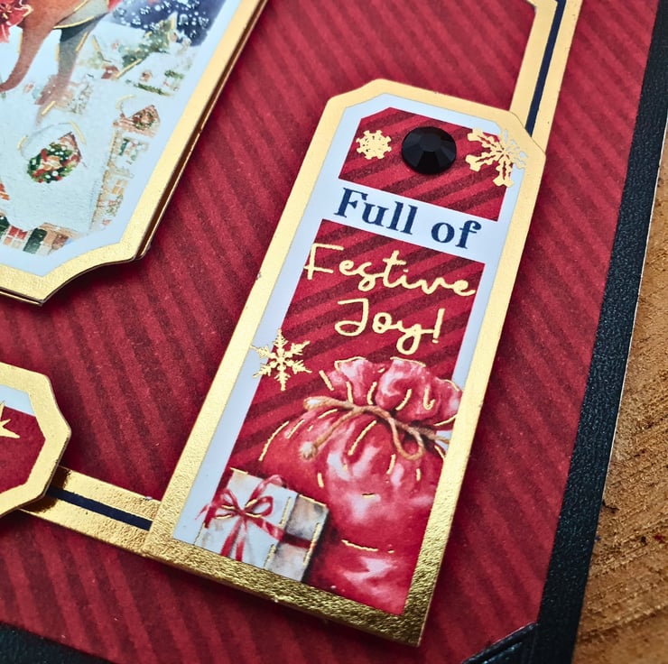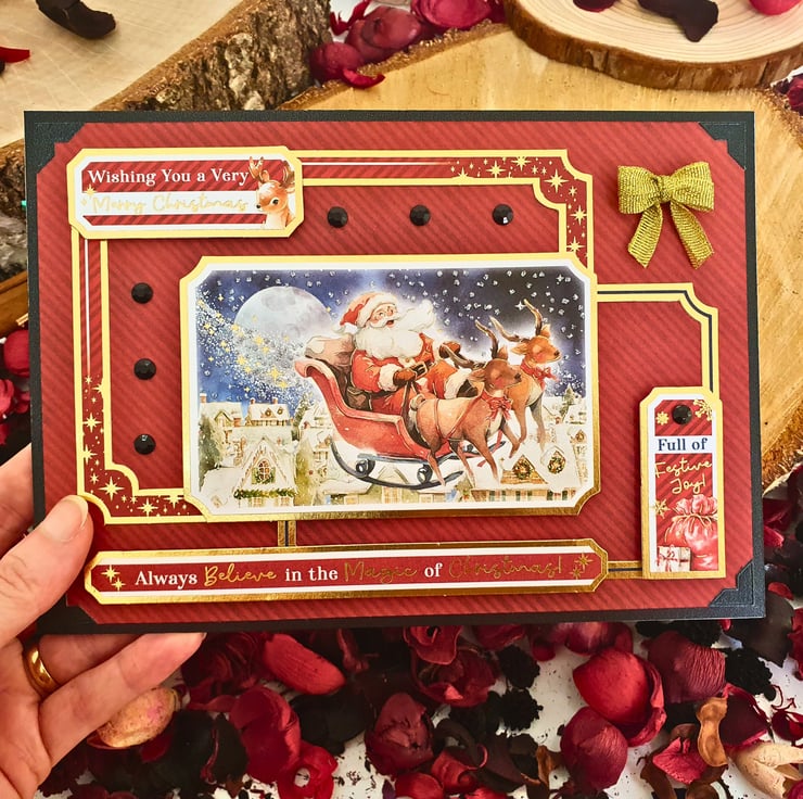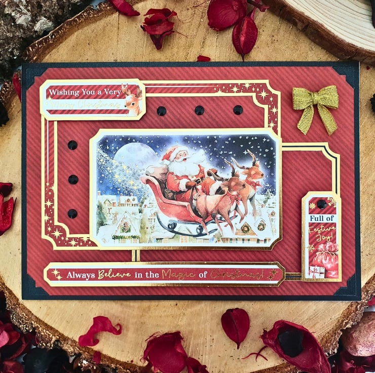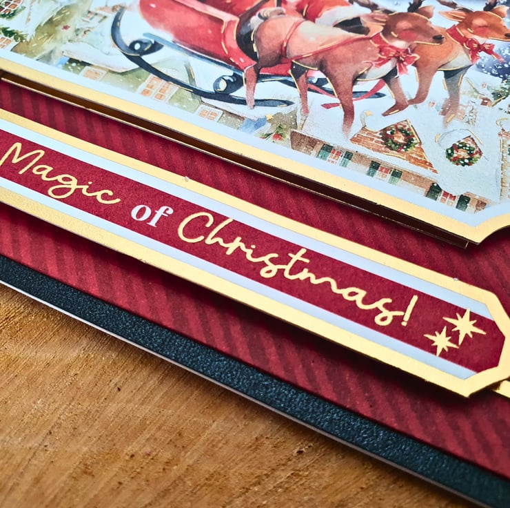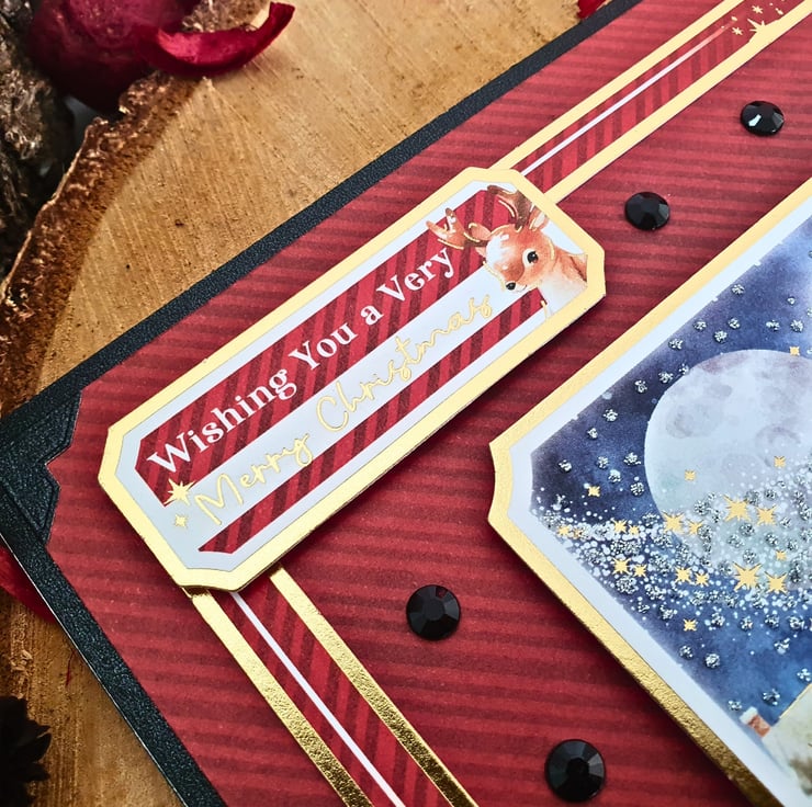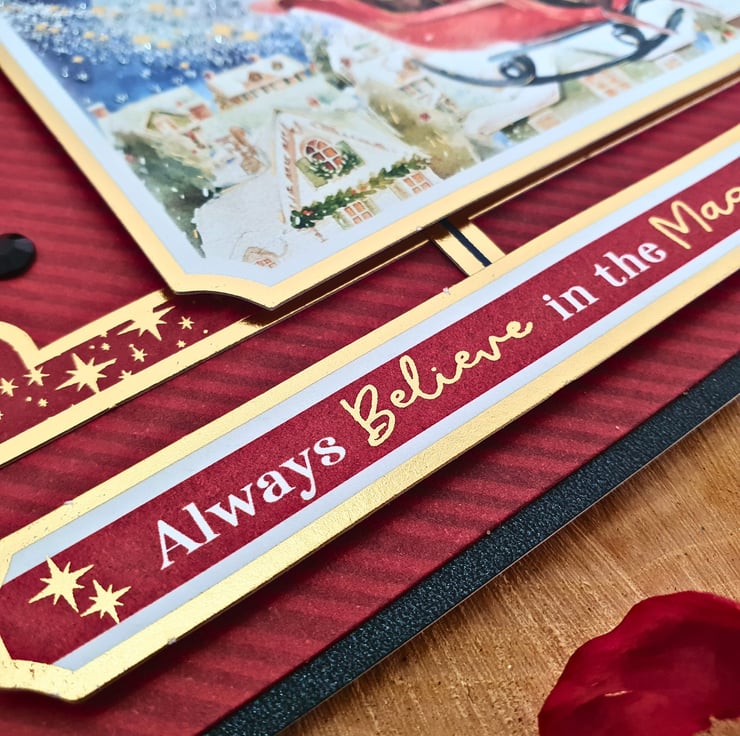 The card consists of mats of black onyx pearlescent card & luxury cardstock with diagonal stripes. The main rectangular topper lays in the middle, surrounded by gold foiled frames spread in the background. The sentiment tags "Wishing You A Very Merry Christmas" & "Full Of Festive Joy" are on top & bottom of either side of the topper, with the sentiment "Always Believe In The Magic Of Christmas" underneath. The card is adorned with glitter accents, black diamante & a gold ribbon bow. Finished with a coordinating insert stamped with the message "Wishing You A Magical Christmas", & bordered with matching, decorative photo corners.