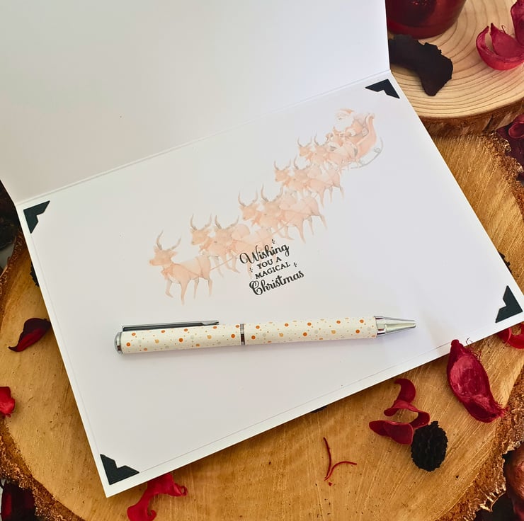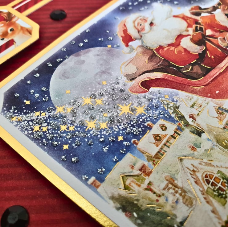 One of a kind handmade Christmas card, with Father Christmas / Santa Claus, travelling in the starry sky, over the houses, on his reindeer sleigh! ! Perfect for sending your magical Christmas wishes to a friend, colleague, neighbour or relative!