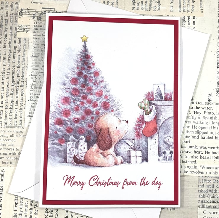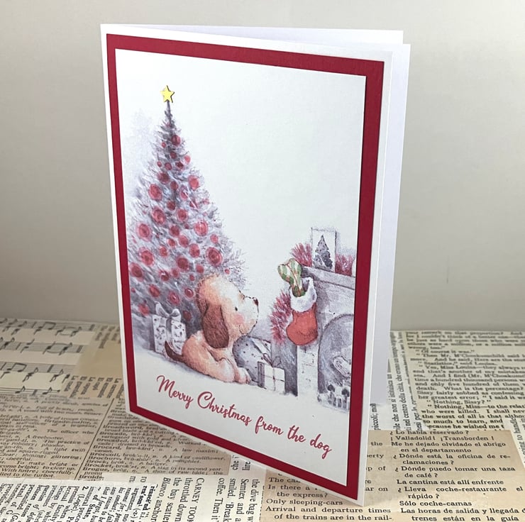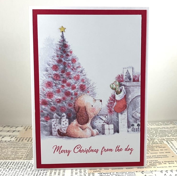 A6 Christmas card from your favourite furry friend. The card features a printed image of a dog sitting alongside a festive fireplace, with a tree in the background. The sentiment 'Merry Christmas from the dog' has been printed below the image and a gold star has been added to the top of the tree. The image is mounted on dark red card.
