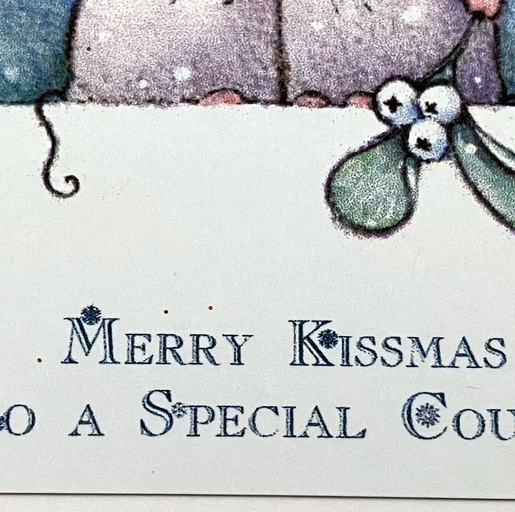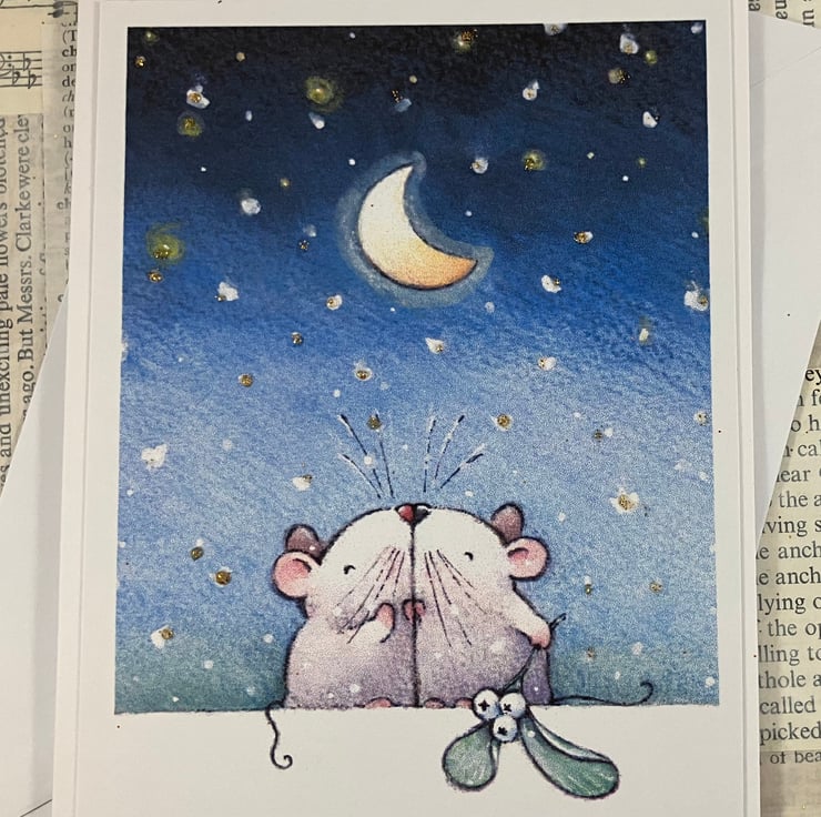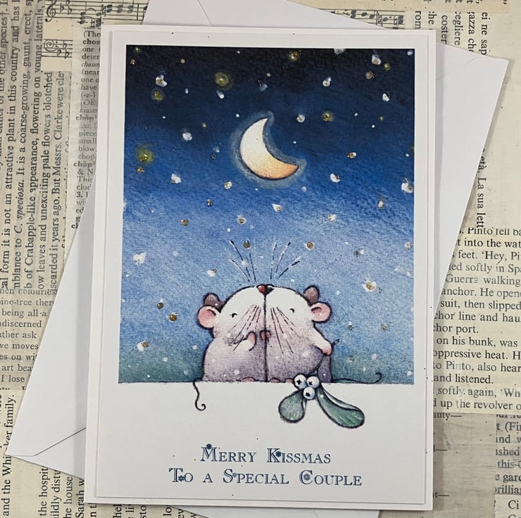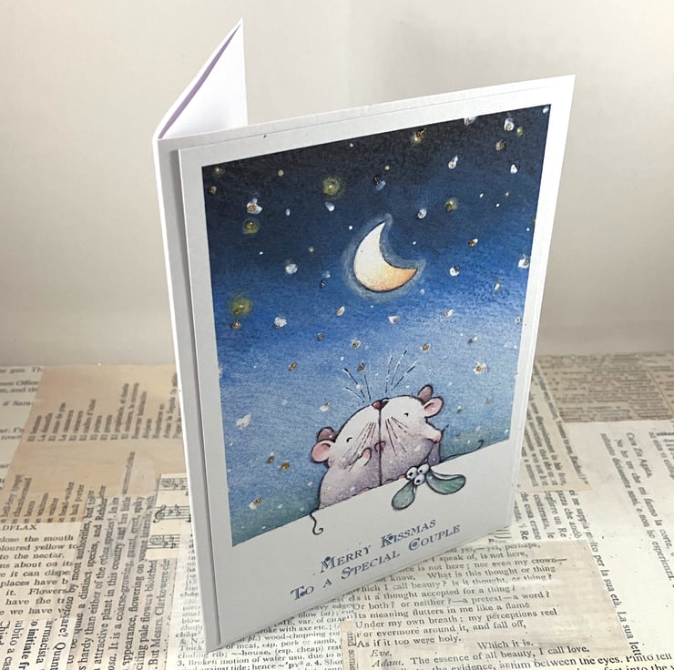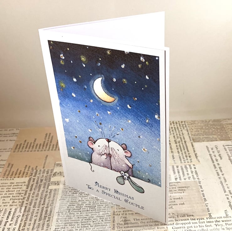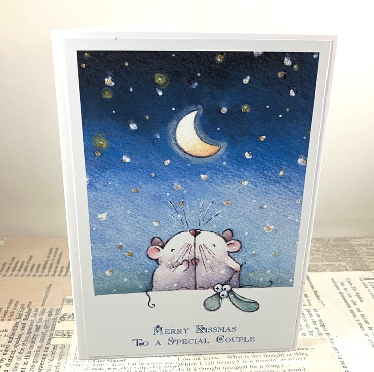 A6 Christmas card featuring a printed image of a pair of mice kissing under the moon and stars, with a sprig of mistletoe. The stars have been given some extra festive sparkle with gold glitter. The sentiment 'Merry Kissmas to a Special Couple' has been printed in blue ink below the image.