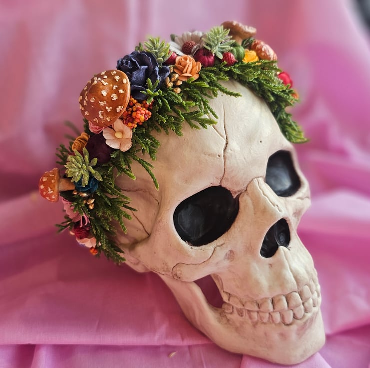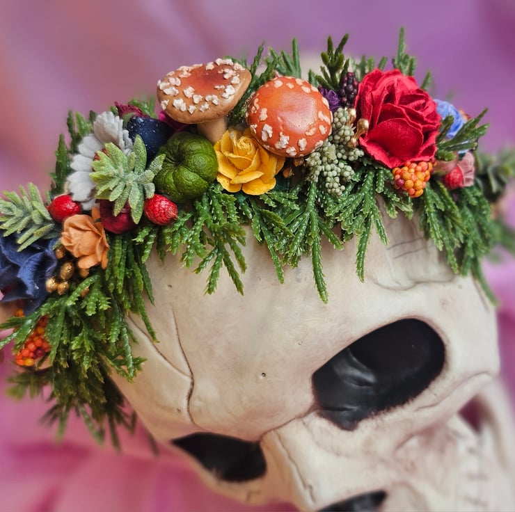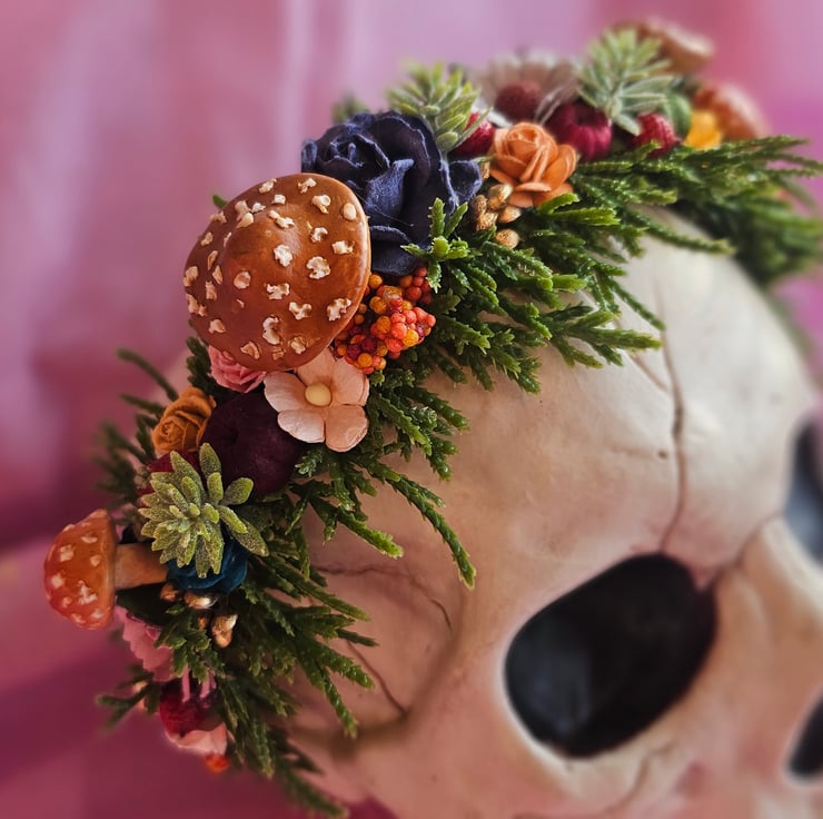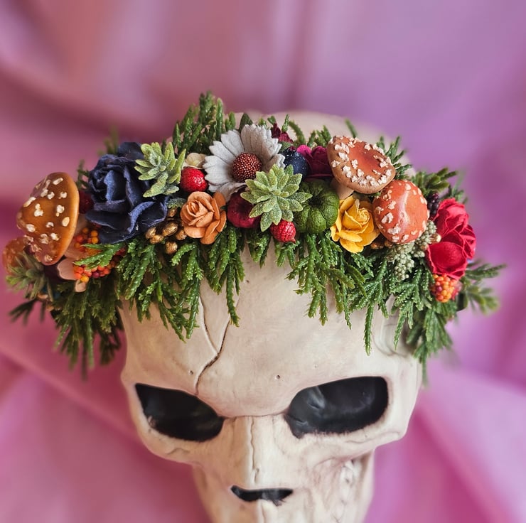 One of a kind flower crown, made using high quality mulberry paper roses and a range of foliage. The mushrooms are handmade by myself from polymer clay. One size fits all. Not suitable for children under age 3 due to small parts.