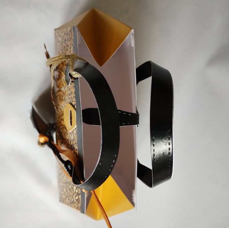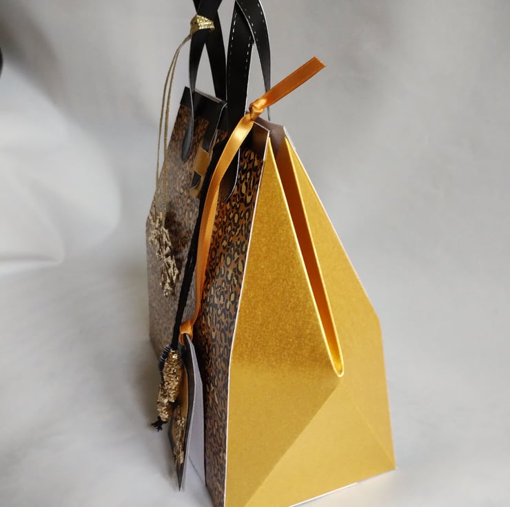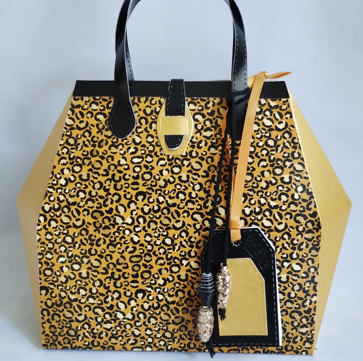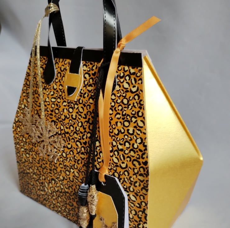This is a unique gold and leopard print gift box made in the style of a 1950s handbag. The premium quality cardstock is a golden yellow and black leopard print pattern to front and back with gorgeous solar gold pearl finish cardstock sides and trimmed with a black pearl finish cardstock top and handles. There is a solar gold faux fastener and co-ordinating paper beads. A couple of gold glitter snowflakes (which can be removed so the gift bag can become a long lasting keepsake) and matching gift tags complete the beautiful details of this stunning and unique gift box.
