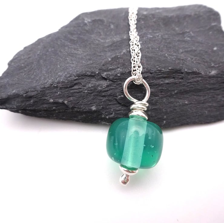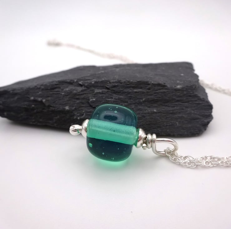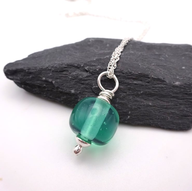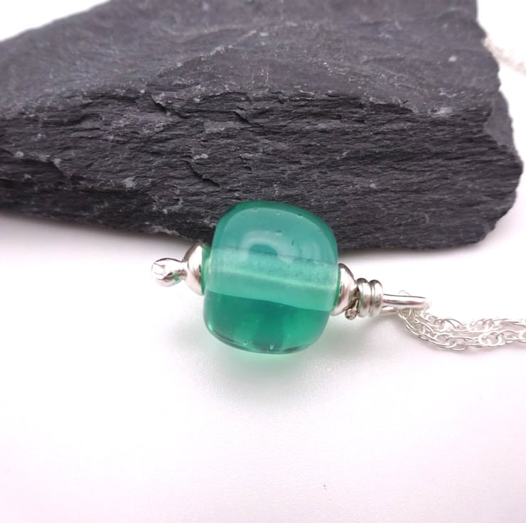 It features a handmade lampwork aqua green glass pendant strung onto a sterling silver chain.