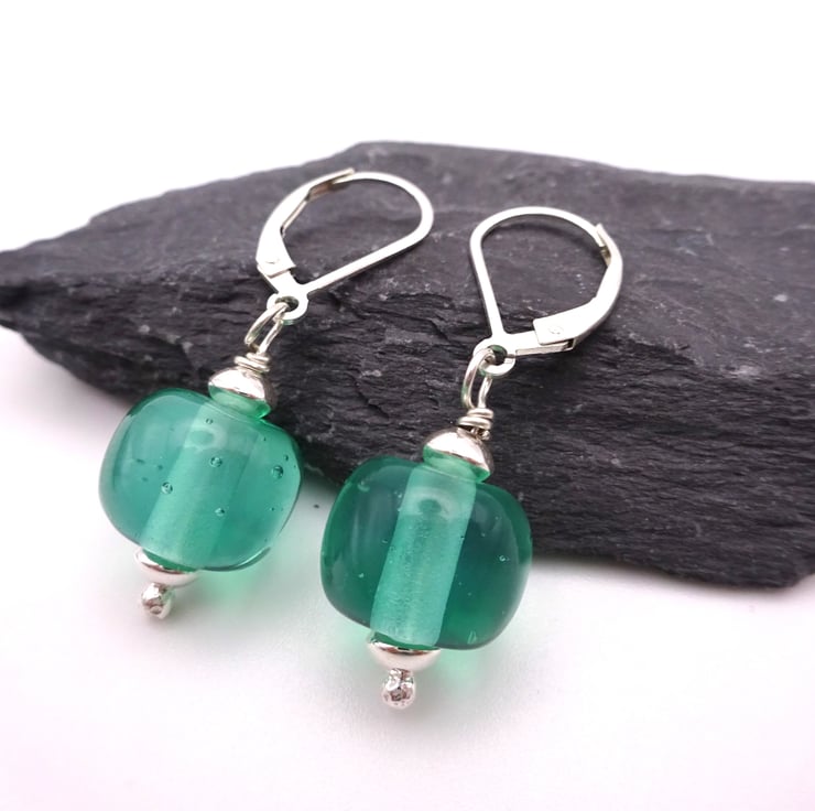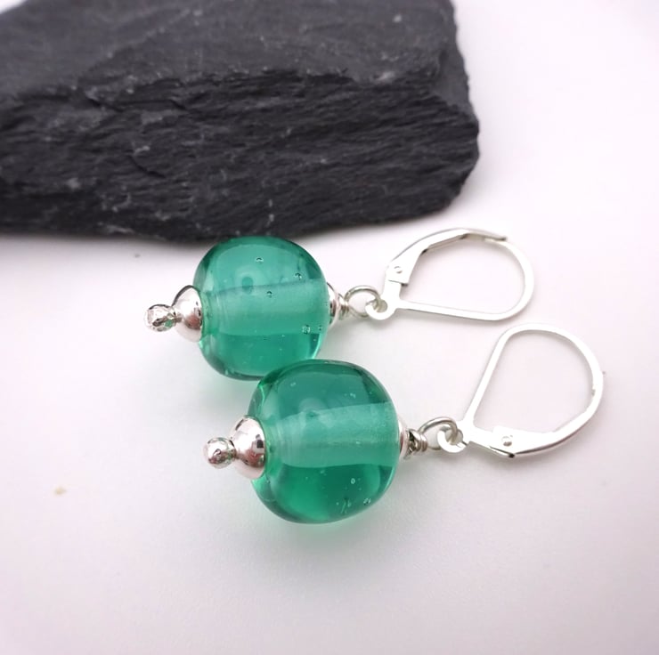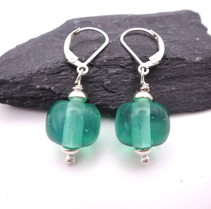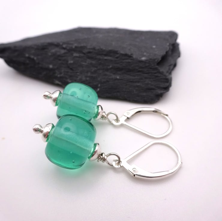 They feature handmade lampwork aqua green glass beads strung onto sterling silver lever back ear wires.