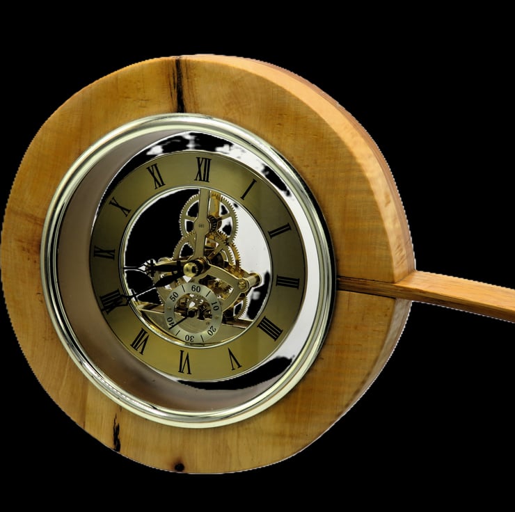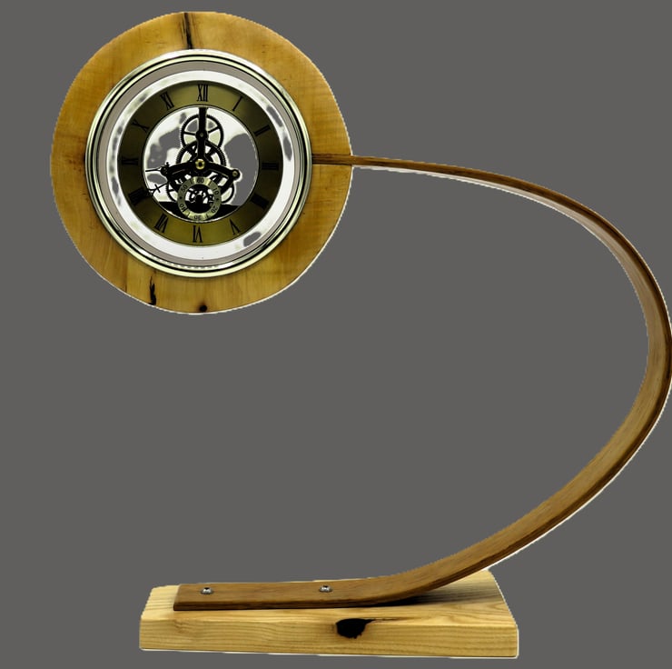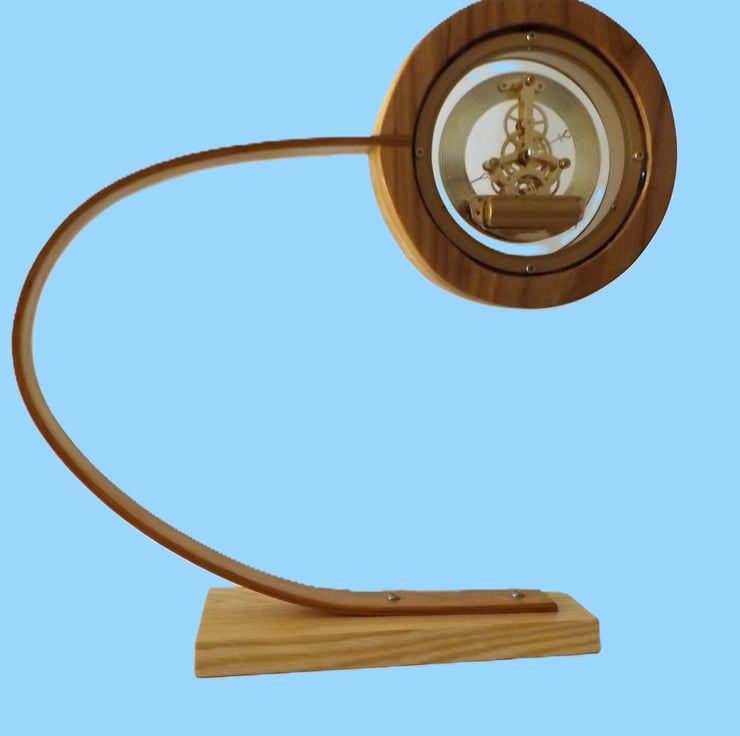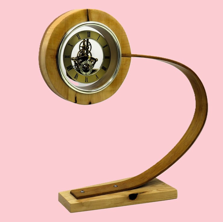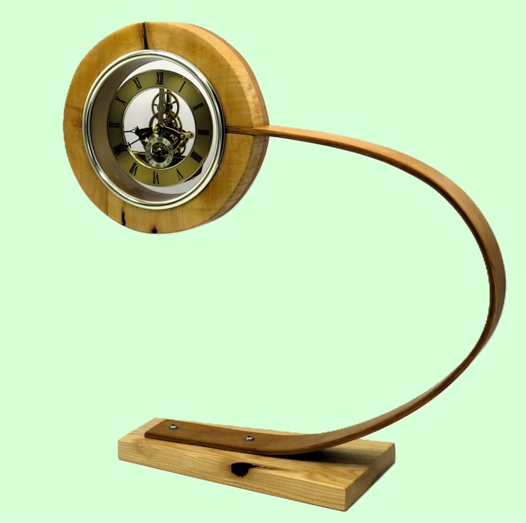 This clock base is in English Ash. The arm that supports the movement is made from two pieces of English Oak laminated together with epoxy resin to make a springy arm which supports the rippled ash face with a natural brown stripe and oak backing disk.