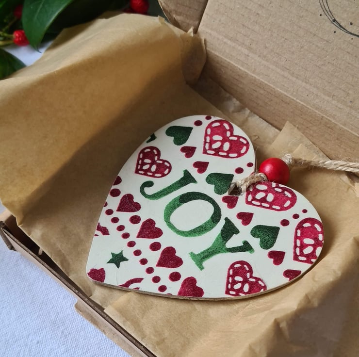 This pretty wooden Christmas hanging decoration has been decoupaged using stylish Emma Bridgewater 'Joy' design paper napkins. It has been decorated on one side only, sealed and finished with a painted red bead and jute twine.