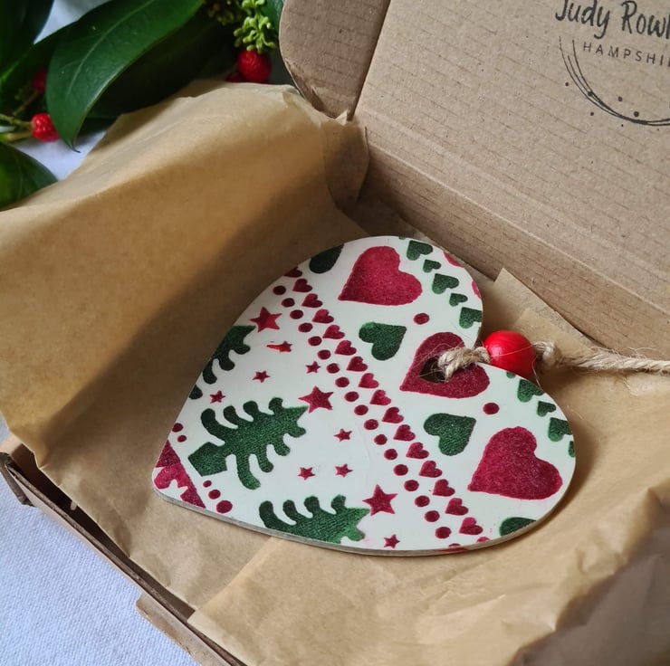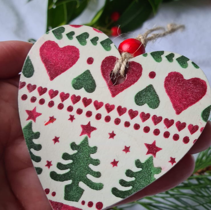 This wooden Christmas hanging decoration has been decoupaged using stylish Emma Bridgewater 'Joy' design paper napkins with pretty hearts and trees detail. It has been decorated on one side only, sealed and finished with a painted red bead and jute twine.