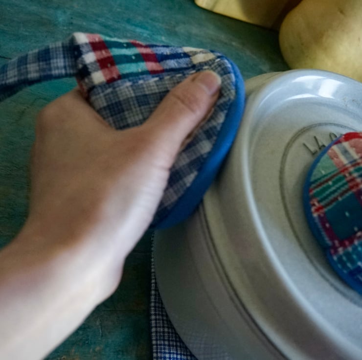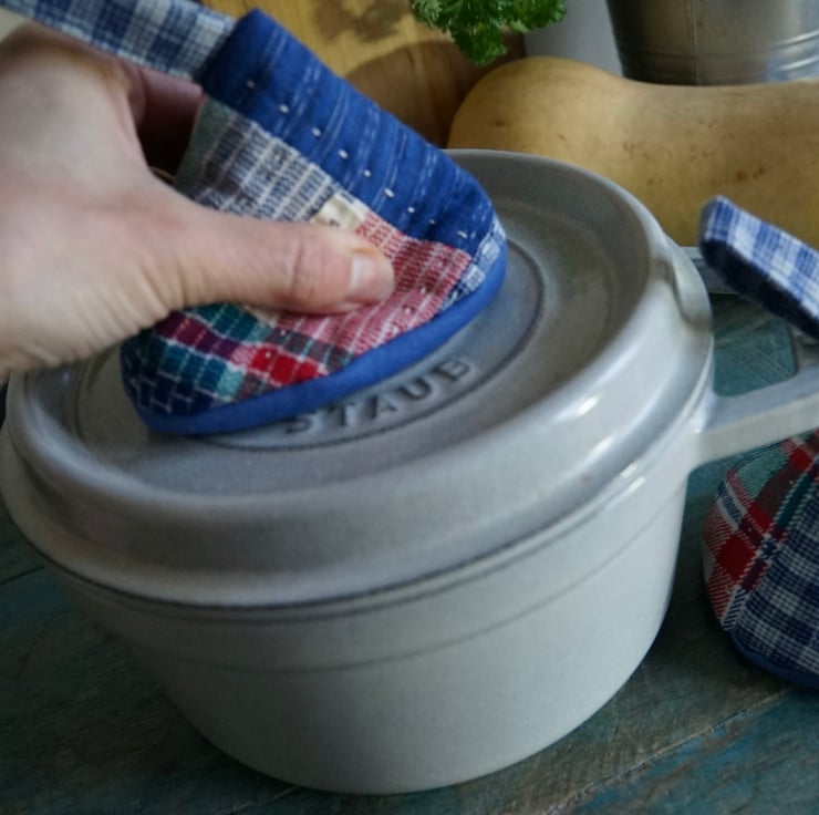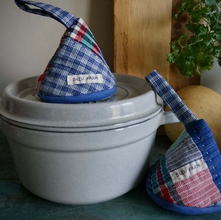 These adorable cone-shaped pot holders are designed to protect your hands while handling the hot lids or handles of cast iron pot or casserole dishes. Handmade from vintage Chinese cotton fabrics, they feature patchworks of a unique texture from the handwoven yarns, and none of them are exactly alike. Measuring roughly 10cmH x 12cmW with a handle of 7cmL each, they are fully lined with heat-resistant batting inside for added protection against high temperatures.