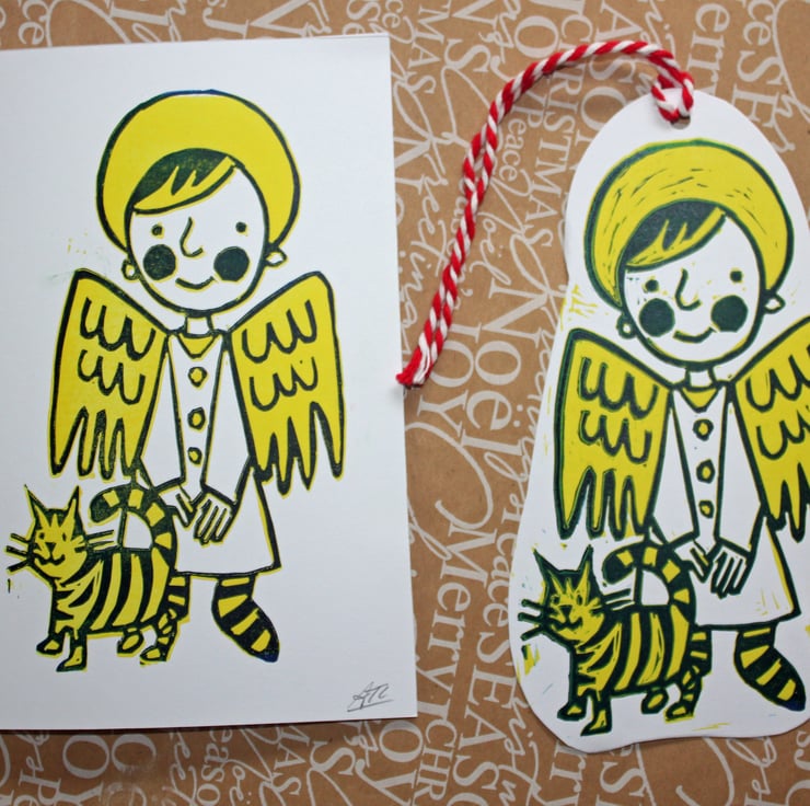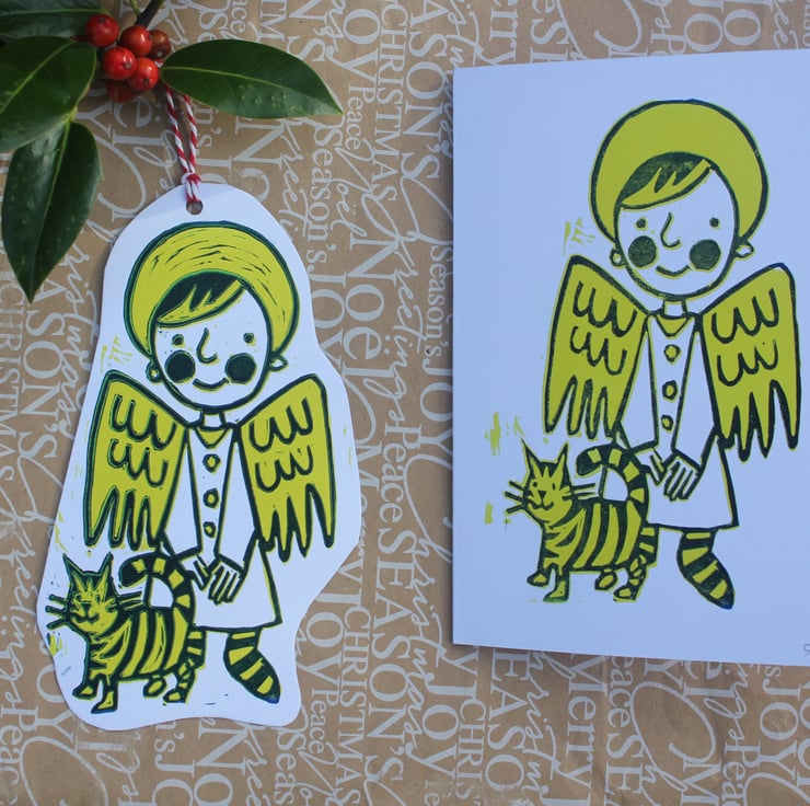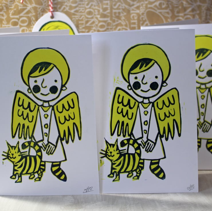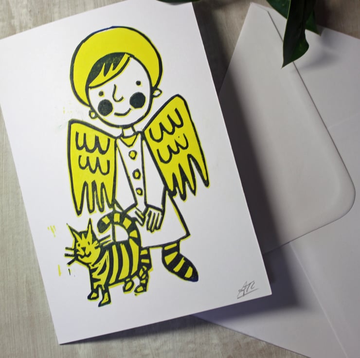5 original linocut card of a nativity angel and their cat. A slightly different version to my other listing.