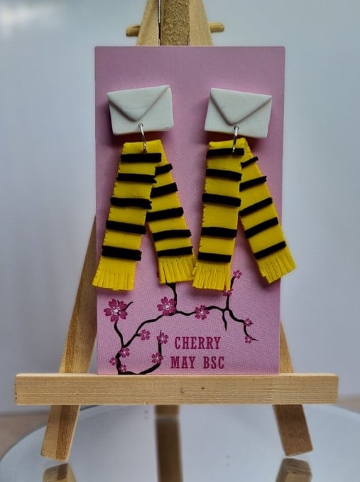 Handmade wizard inspired, scarf shaped earrings, made of yellow, black and white polymer clay. Has a stud at the top embedded into an envelope.