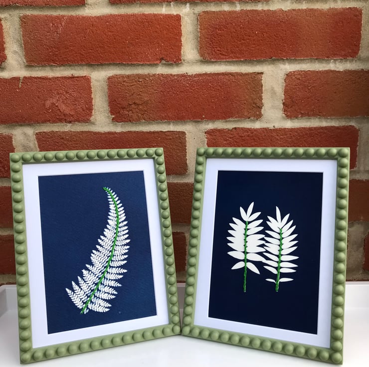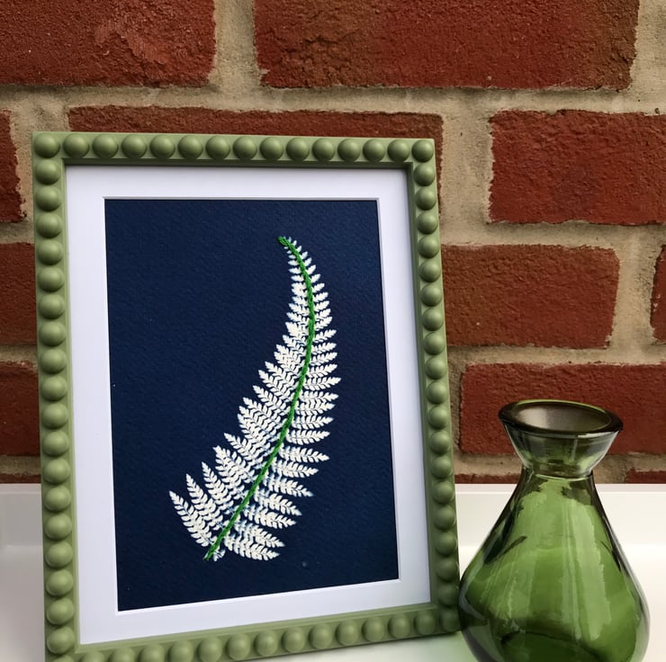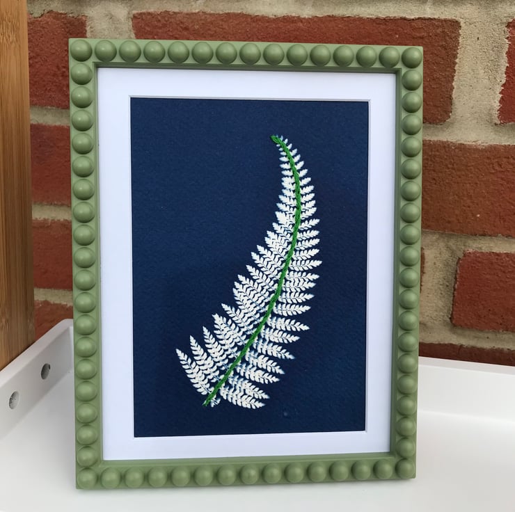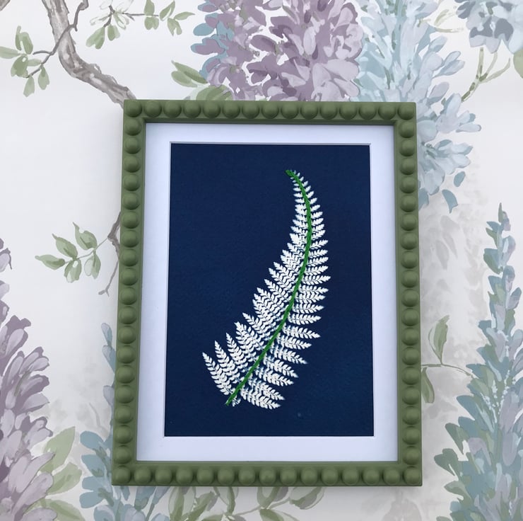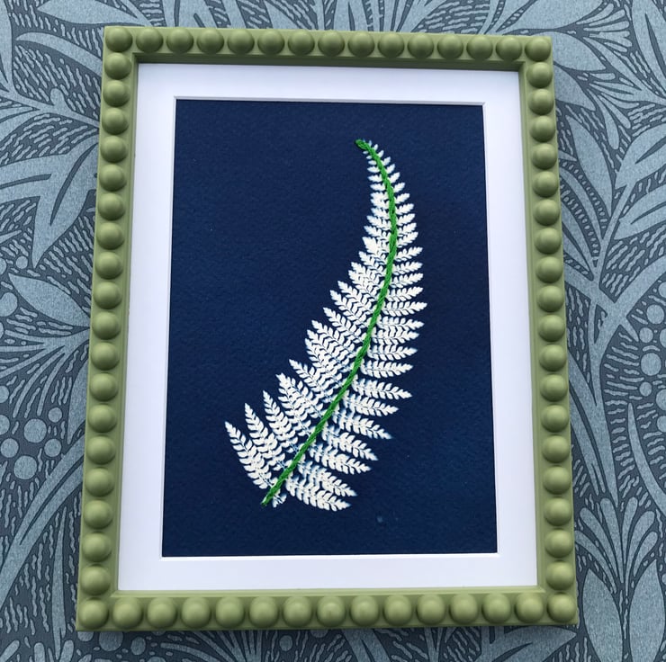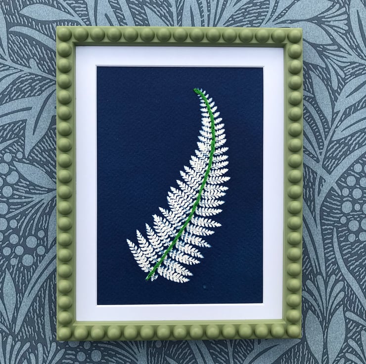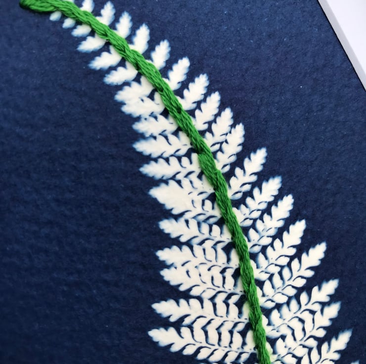 A sweet fern adorned with simple embroidery stitches on its stem. A staple in my garden ferns fill the shady corners with their shapley fronds, and after being trimmed back in spring, they soon send new shoots up which unfurl and spread into beautiful new lush green leaves. This photogram would be a lovely gift for a Gardener, and add some botanical charm to a family room or workspace.