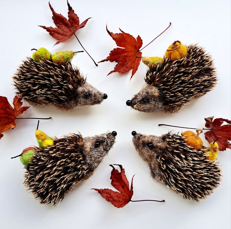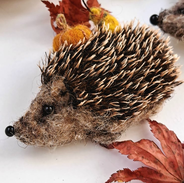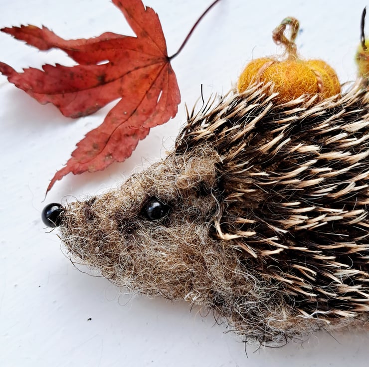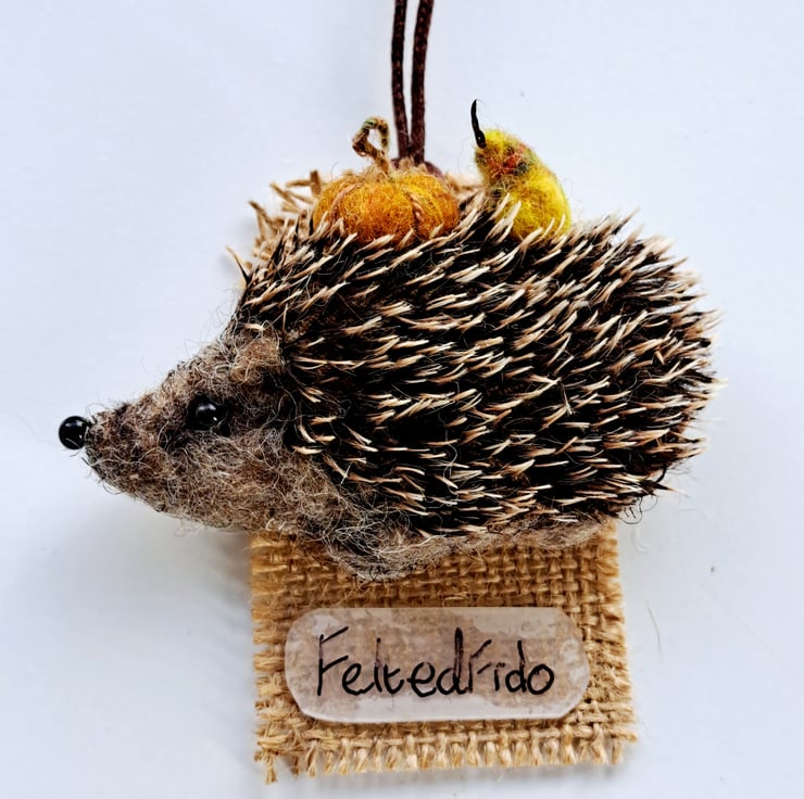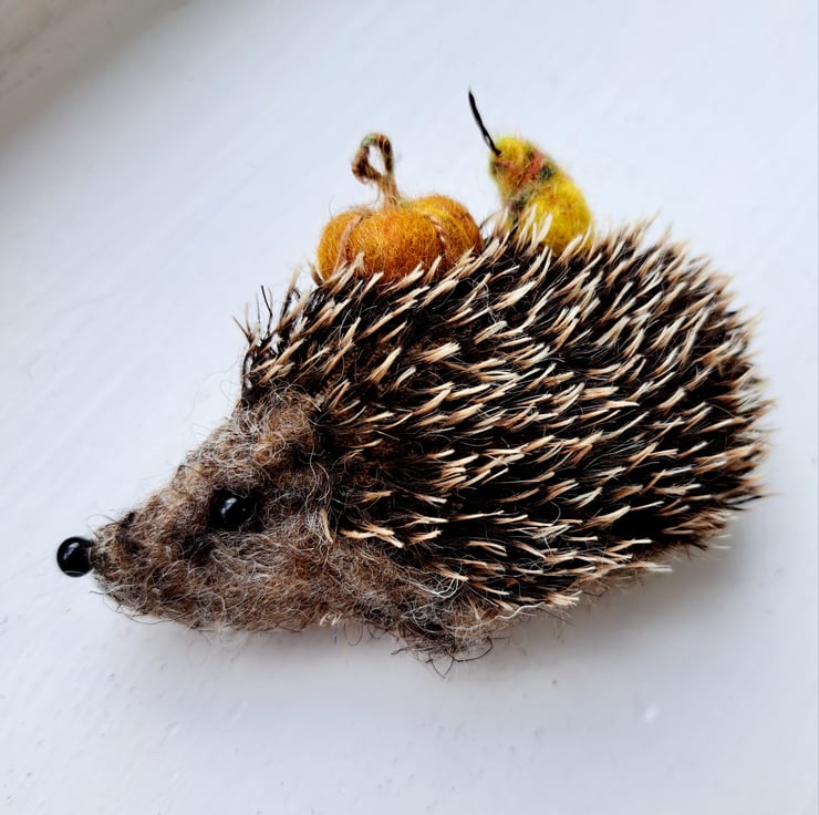 Needle felted hedgehog brooch with tiny felted pumpkin and pear ,measure approx 3 inches long .Metal brooch fixing on back.
