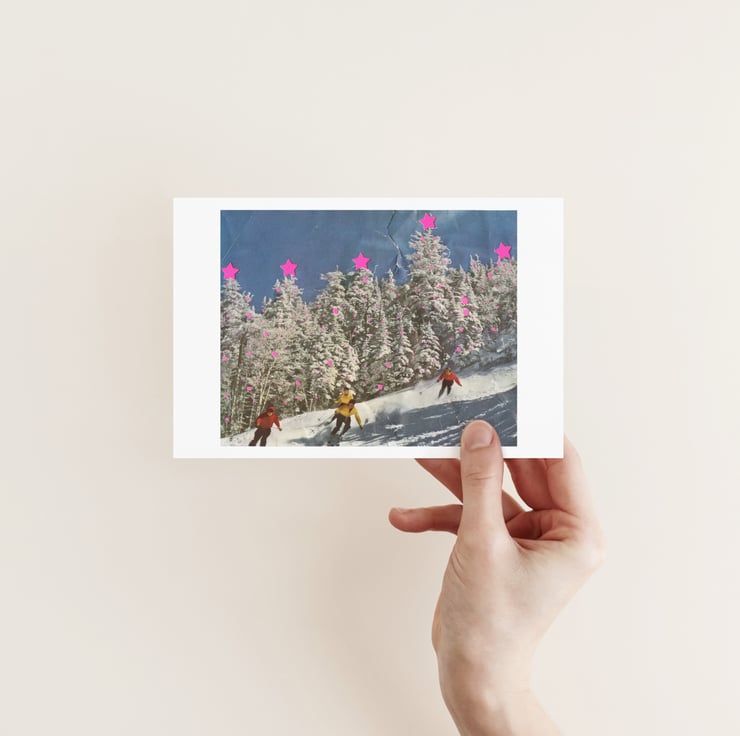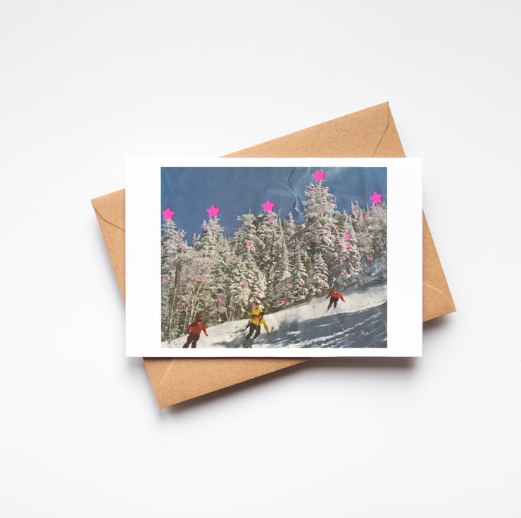 A retro ski scene with a modern edge. This winter fun Christmas card will make a loved one smile.