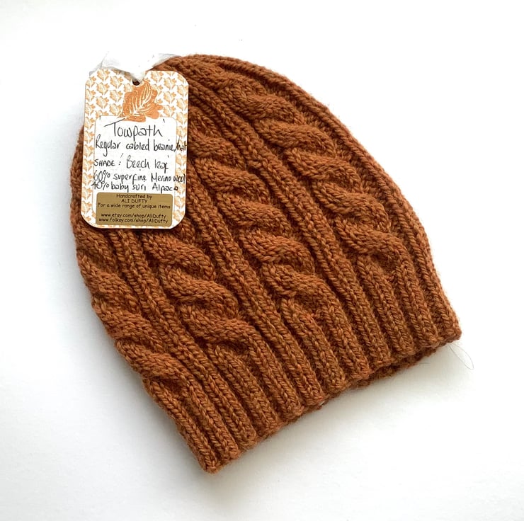 I have designed and knitted this regular beanie hat ' Towpath' in a classic cable pattern using a exquisitely soft and luxurious baby Alpaca / Merino wool blend yarn . Lightweight but super-cosy.