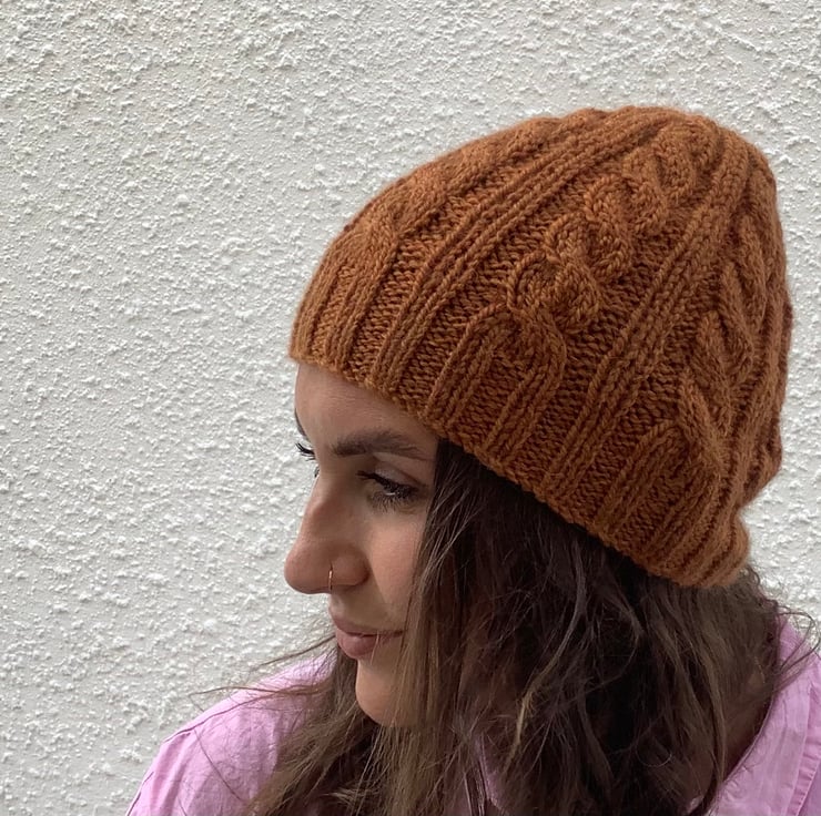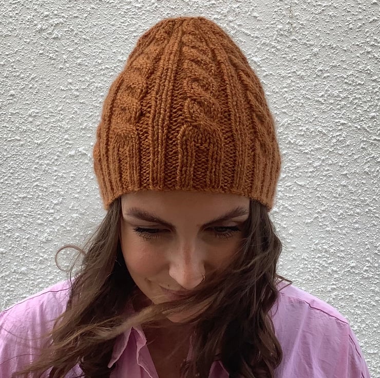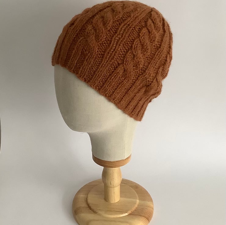 BEANIE HAT .' Towpath' . Luxurious baby Alpaca, Merino wool. Cabled . Russet.