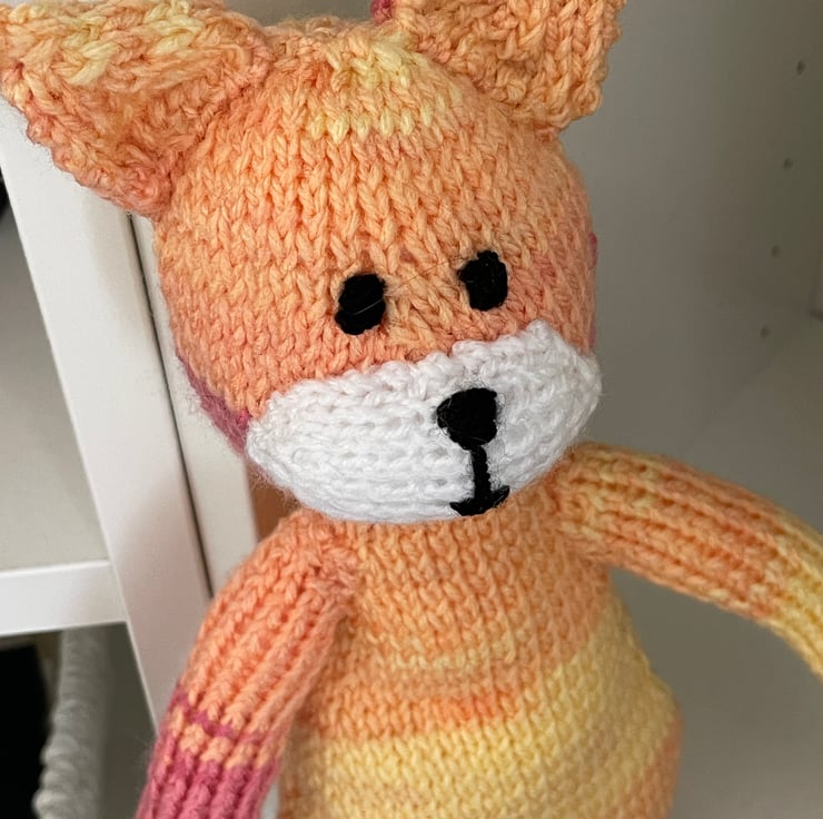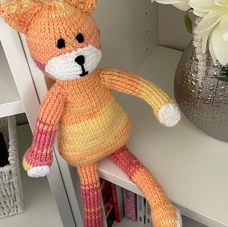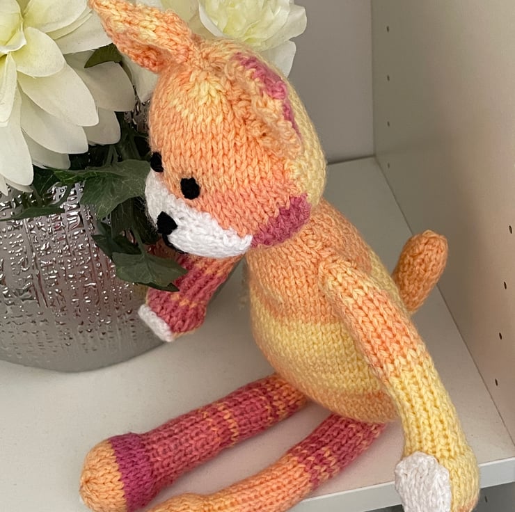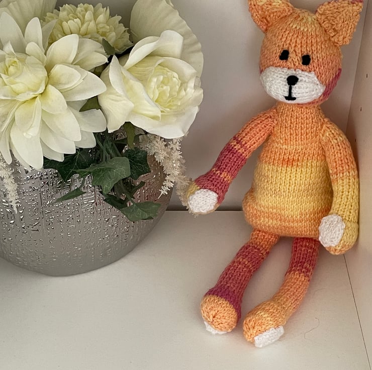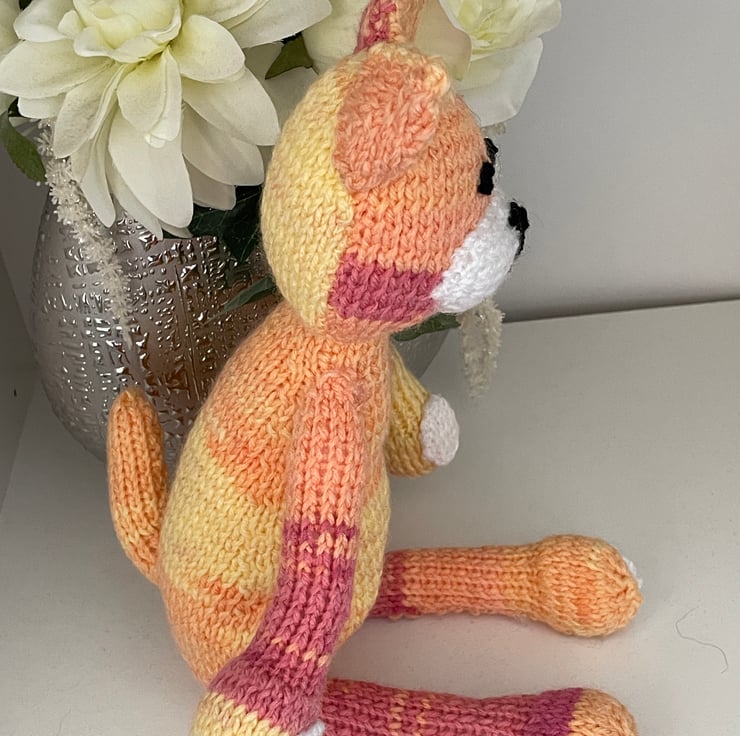 This lovely sunny cat is hand knitted from double knitting wool which is shades yellow and orange and colours in between. The cat is filled with soft toy filling which complies to BS1425, BS5852 and EN71 standards.