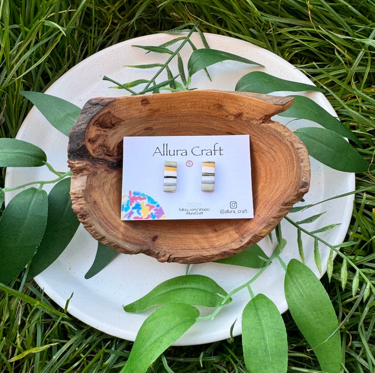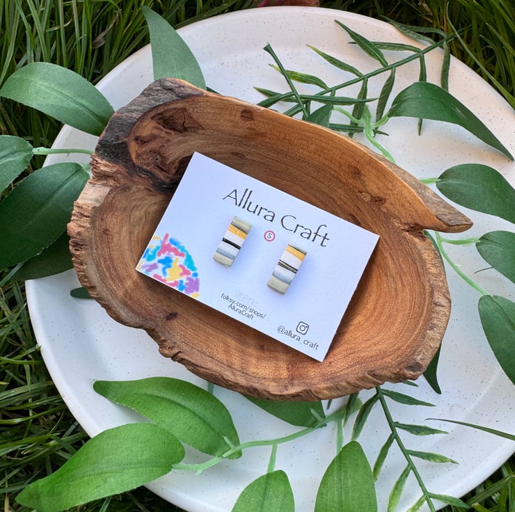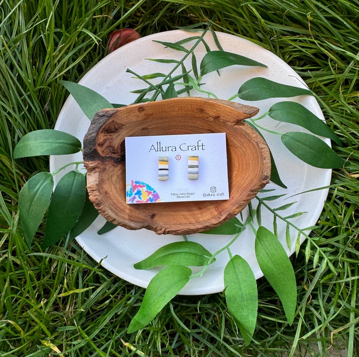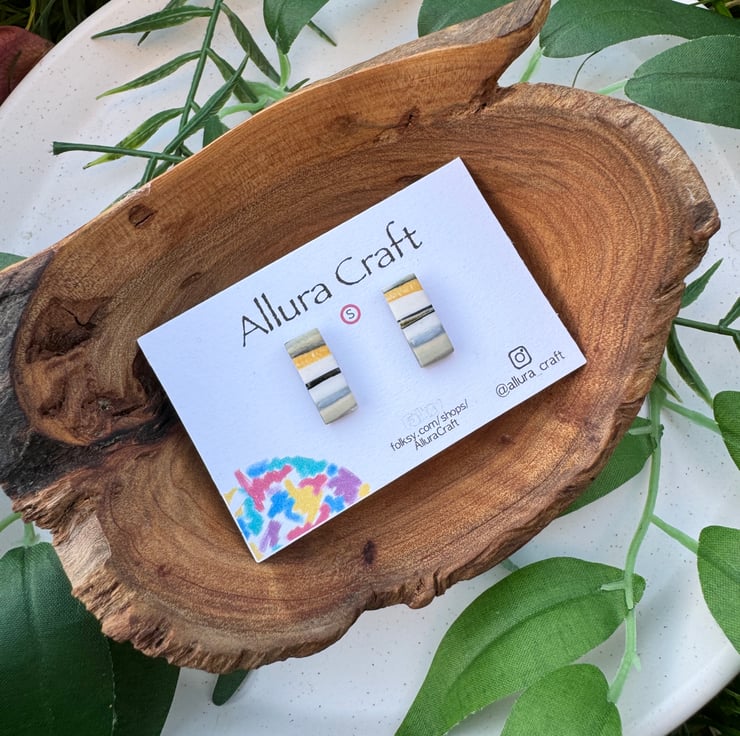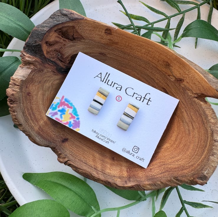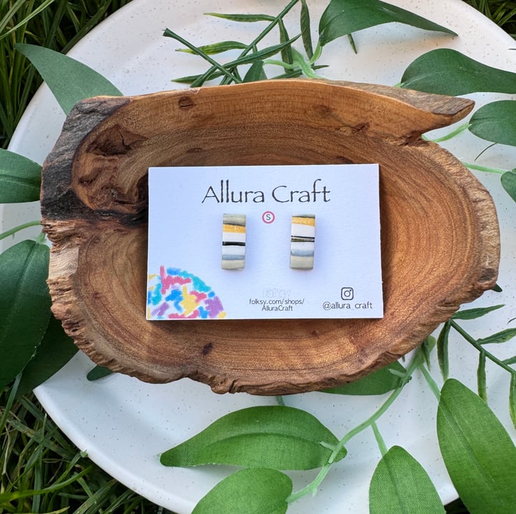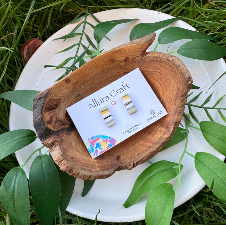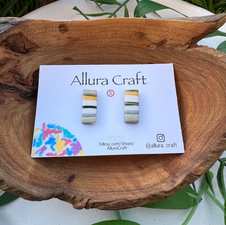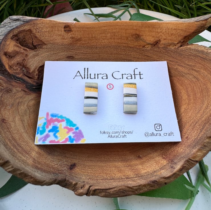 Small reworked polymer clay producing natural stripes and lines of mustard, black, grey and white and taupe.