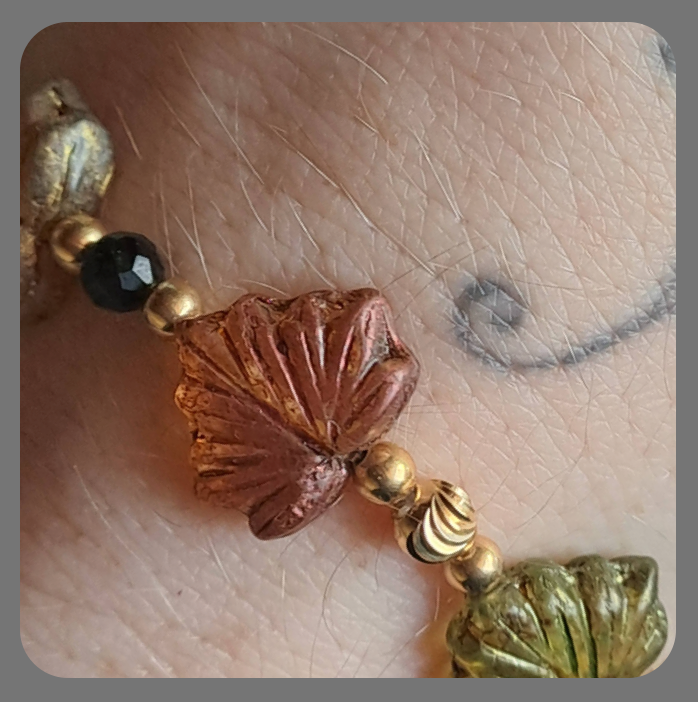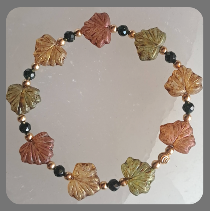 Pretty bracelet made with Czech glass Maple Leaves, Green Goldstone and vermeil (gold plated sterling silver).