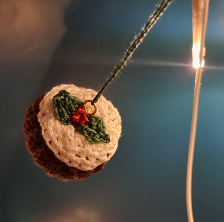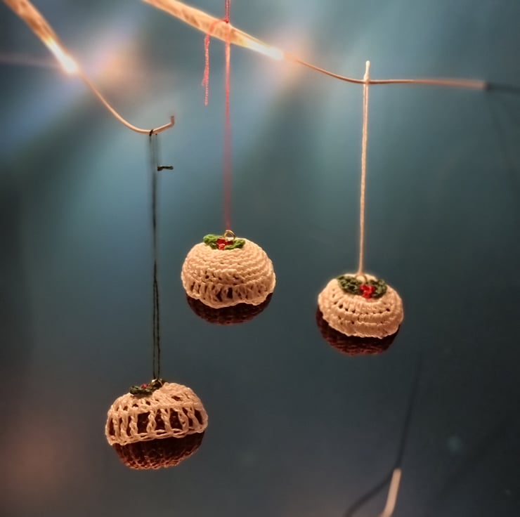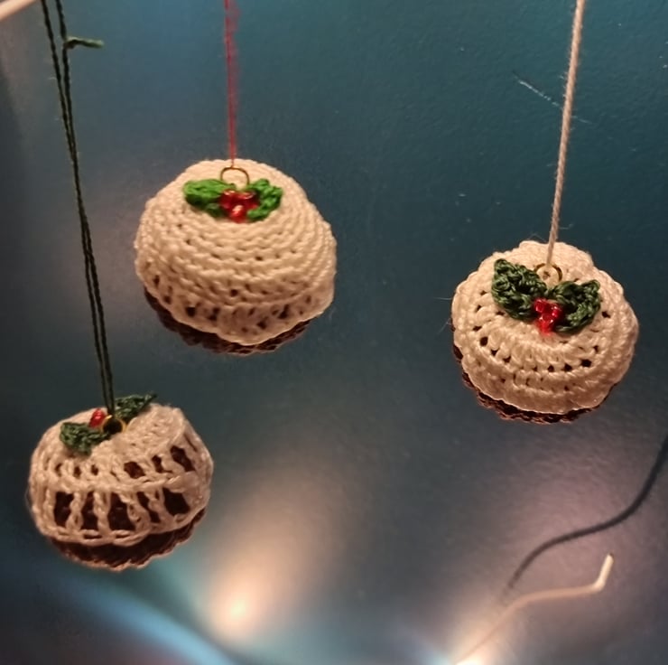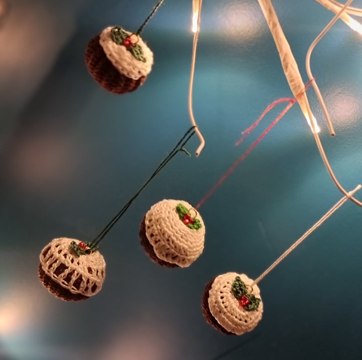 These little christmas puddings (diameter of a 2p) are crochet and bead decorations ready for you little tree or to add to a wreath for a festive touch.