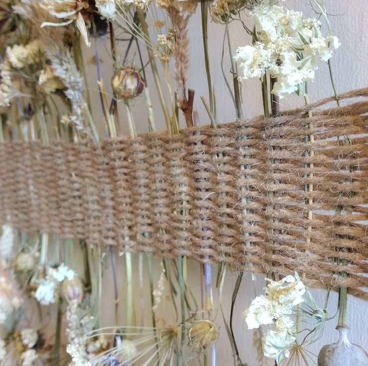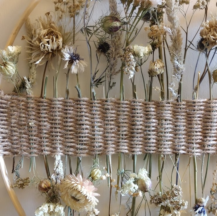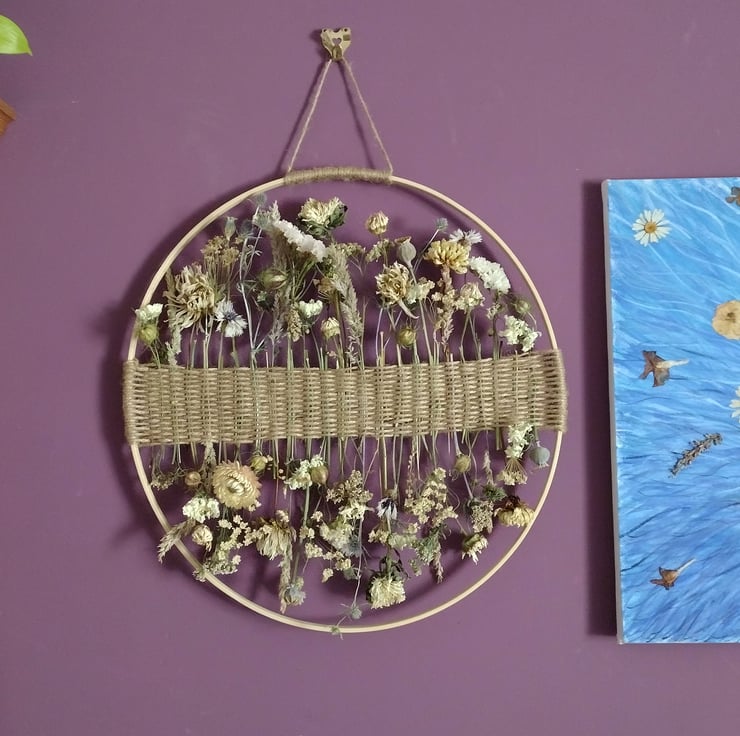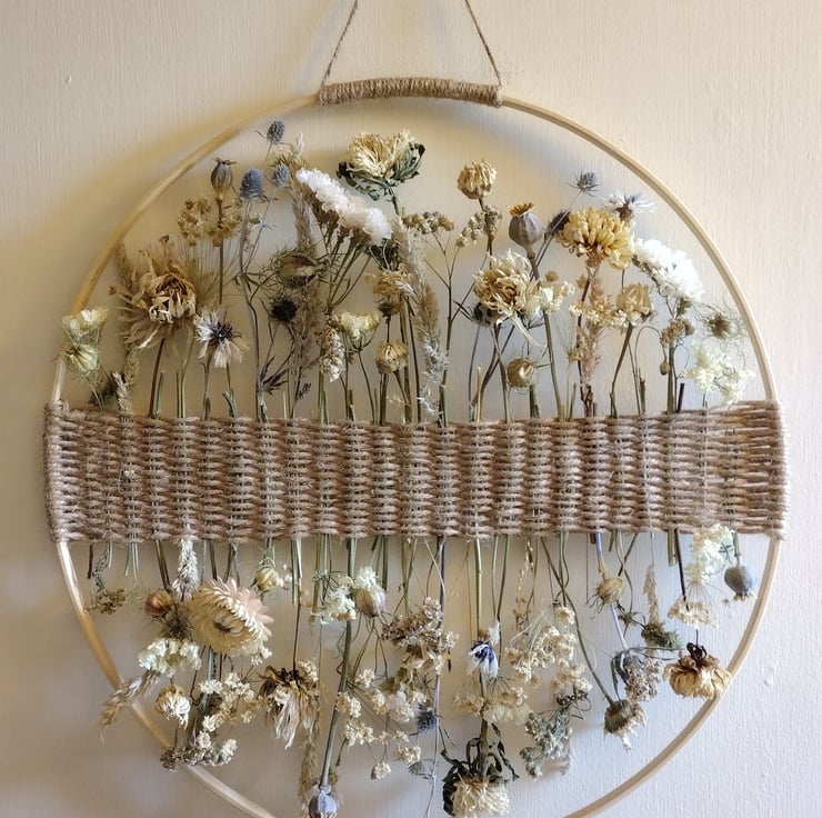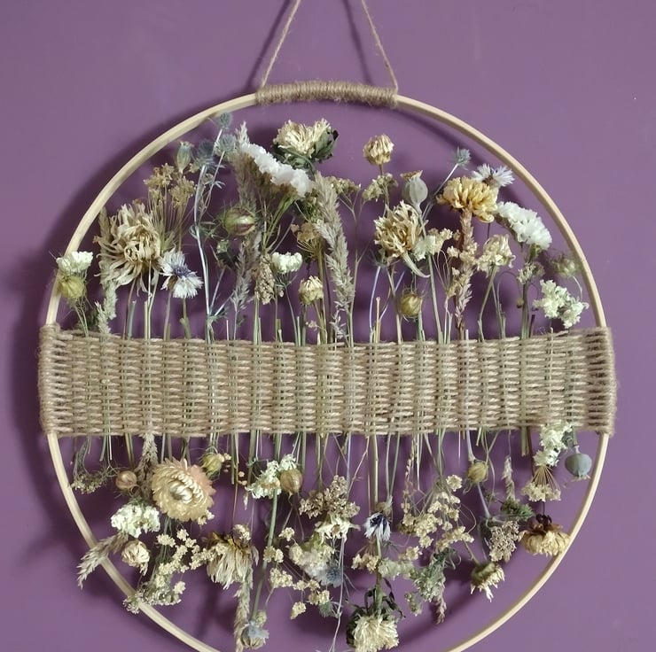 The piece comprises dried flowers carefully woven into a band of twine, mounted on a bamboo hoop. Each stem has been individually chosen to create a delicate collage of natural beauty. The flowers were organically grown in peat free compost, picked and dried right here in the Fens from our wildlife friendly garden.