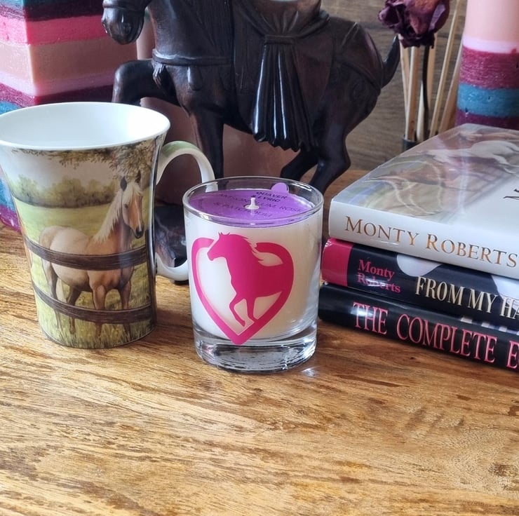 Scented candle with a fuchsia coloured horse in heart design on the glass container. Ideal horse lovers gift. Handmade in Northamptonshire using a quality rapeseed and mineral wax blend, the finest range of fragrances, hand-poured into quality glass containers and supplied in a kraft box. The design on the scented candle is made from permanent vinyl which can be cleaned (hand wash only) allowing the glass to be re-purposed as part of your home decor after the candle has burned.