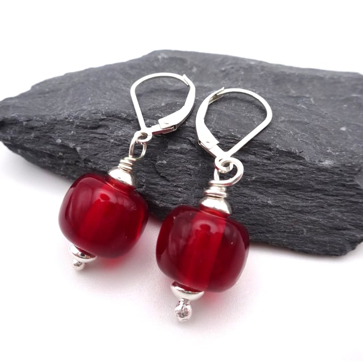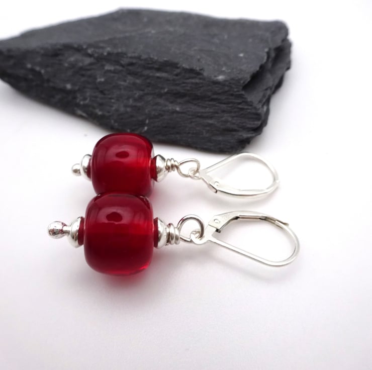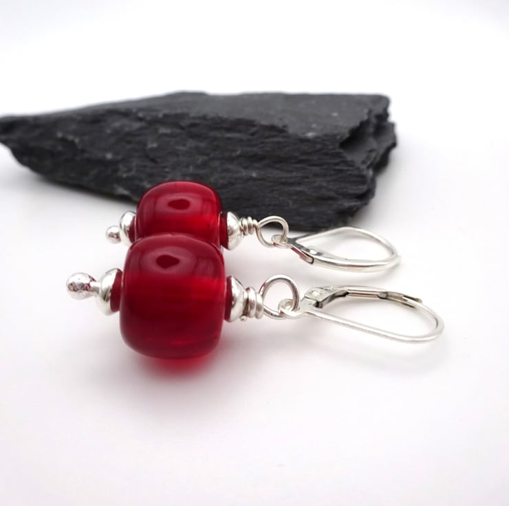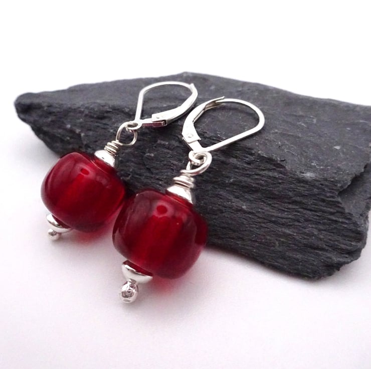 They feature handmade lampwork red glass beads strung onto sterling silver lever back ear wires.