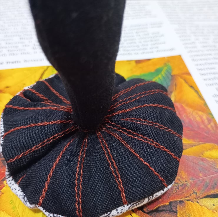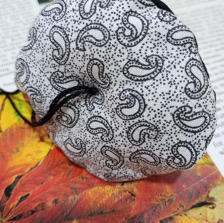 This toadstool has been made from beautiful quilting cotton in a monochrome paisley style pattern in black and white, and has a black underside and stem. The gills on the underside are machine stitched in a contrasting chestnut brown and the whole mushroom is gently stuffed to give it that special mushroom-y texture and look. The hanging loop is made from embroidery silk.