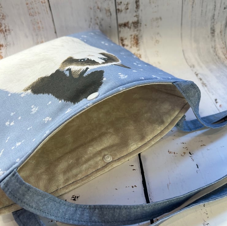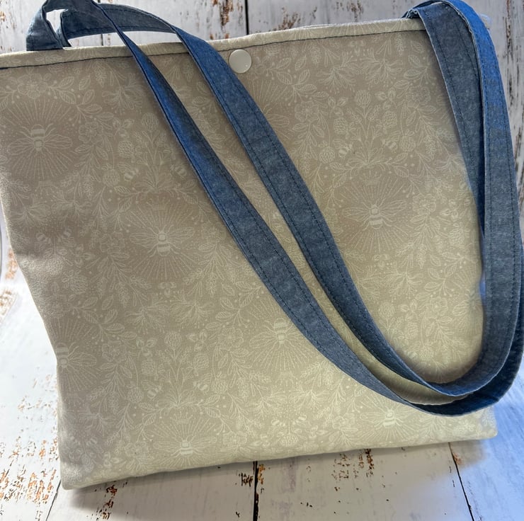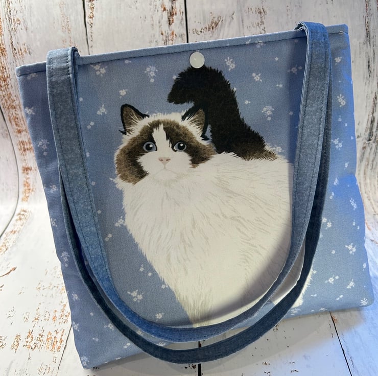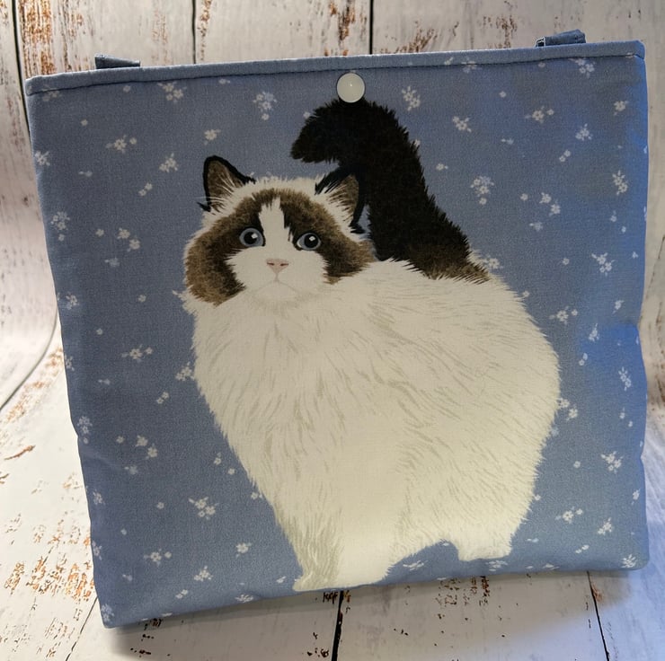 Fun and quirky small tote bag with an image of a predominantly white cat with brown markings and a black tail with a pretty blue coloured background printed onto 100% cotton fabric. Bag is handmade, fully lined and padded with a soft interfacing. The back of the bag and the lining is a cream/ivory colour 100% cotton with a subtle bee print. The handles are made using a co-ordinating fabric and each is 53cm in length, giving approximately a 20cm drop from the top of the bag. The bag size is 24cm wide by 22cm deep. It is finished with a snap closure.