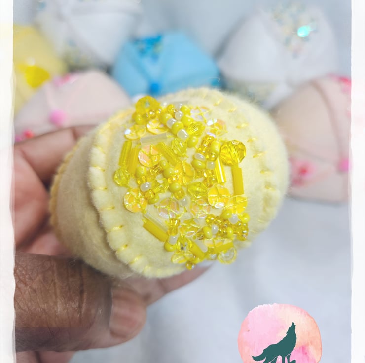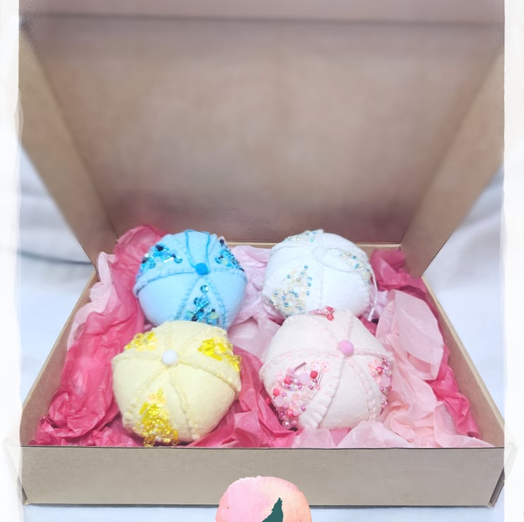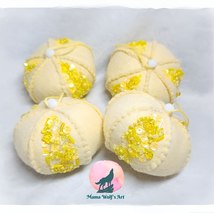 The bauble is handmade from wool blended felt, and embroidered with small glass beads, glass bugles, small crystals & sequins to add a touch of sparkle to your christmas decorations. Each bauble is stuffed with polyester toy stuffing.