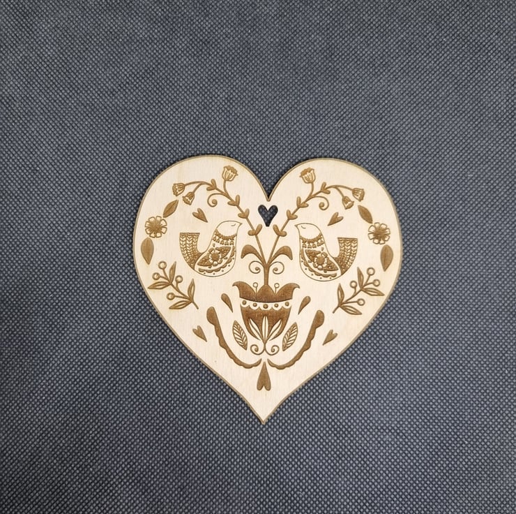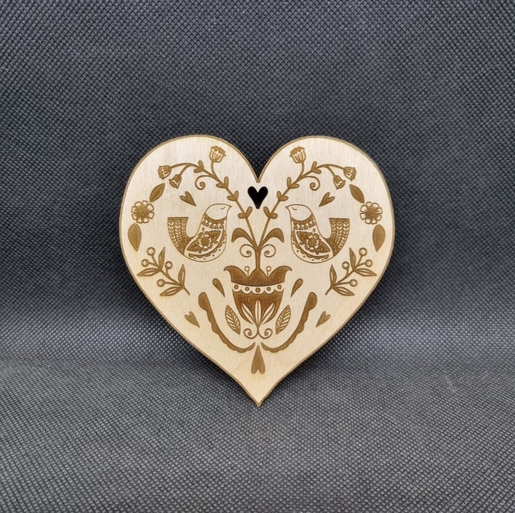 2 Love Birds, Folk Art Laser-etched and Laser cut from ply-wood, hand drawn