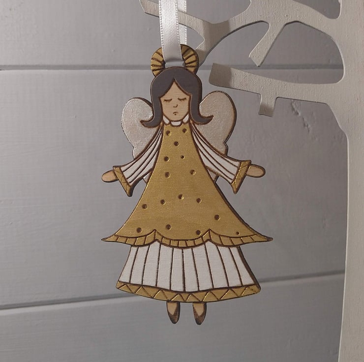 Golden Angel, laser-etched & Laser-cut in wood, hand painted