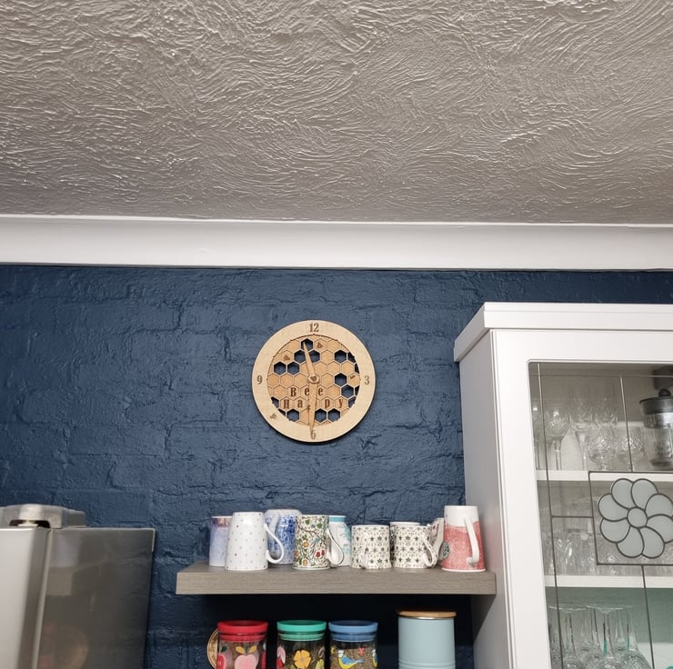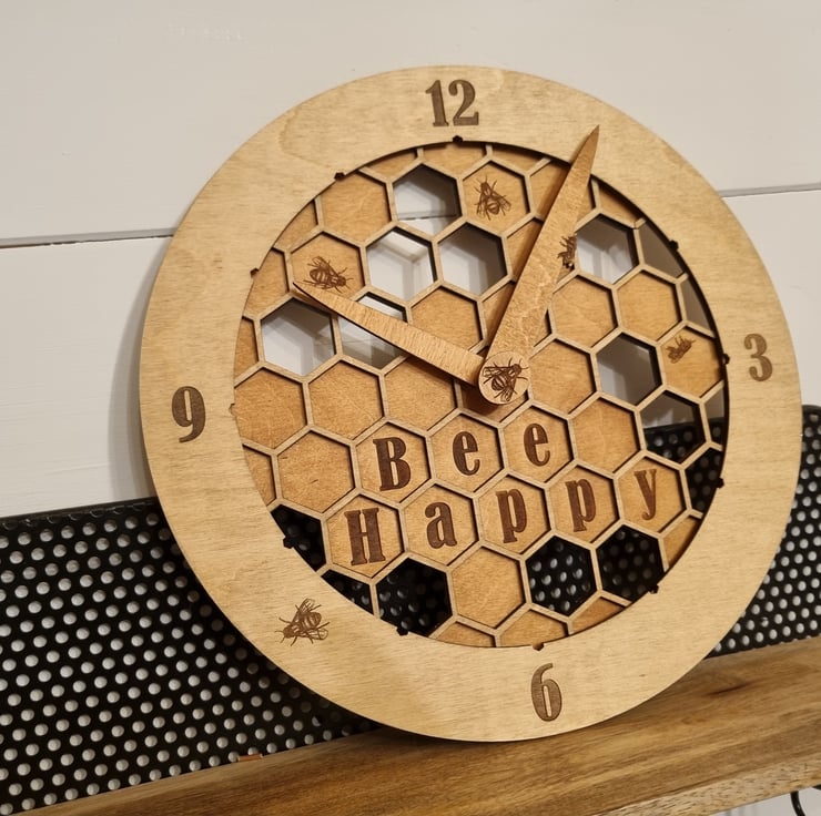 Bee Clock, Honeycomb design, laser-etched and laser cut from 3 layers of plywood