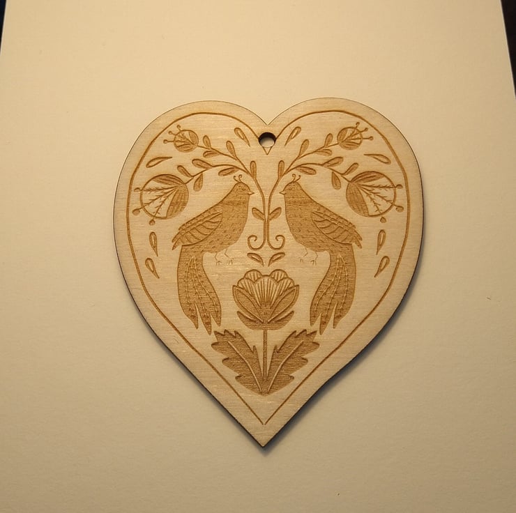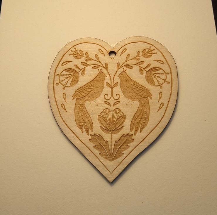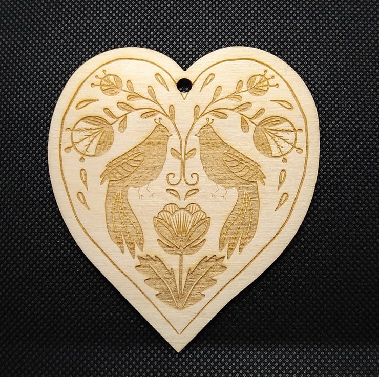 Partridge Love Heart decoration, laser-etched and cut, this is a wooden hanging decoration, will be supplied with twine.