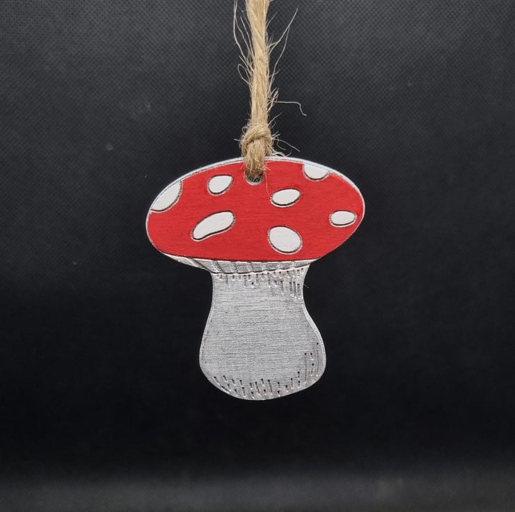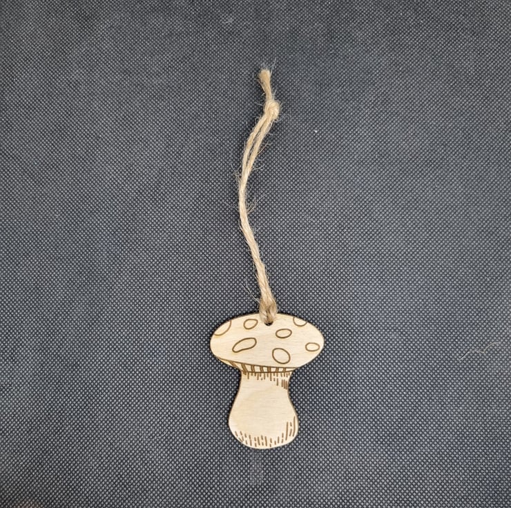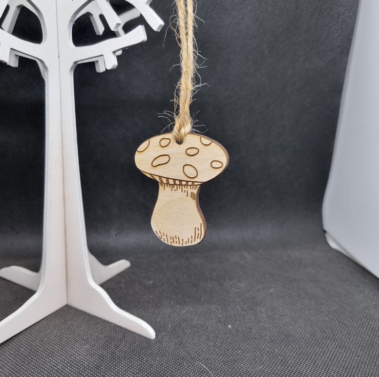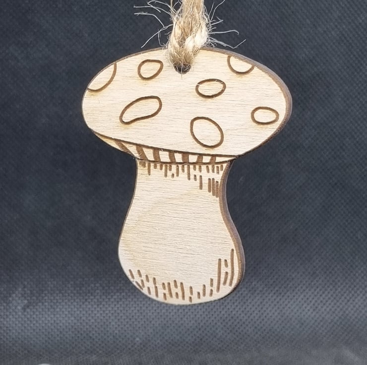 Mushroom hanging decoration, laser-cut and laser-etched on wood