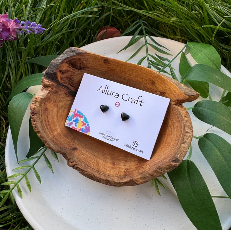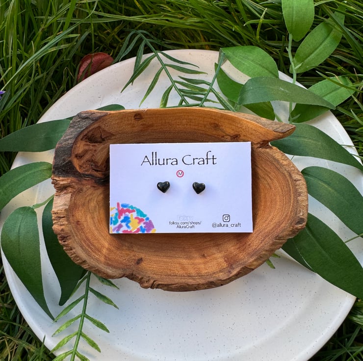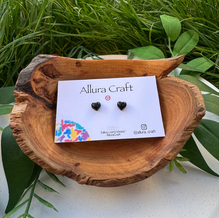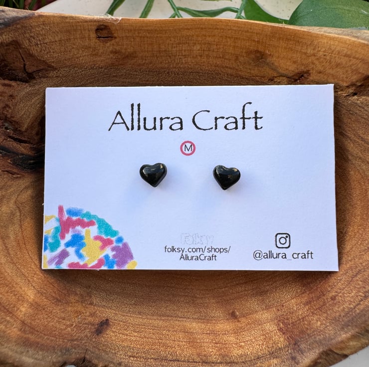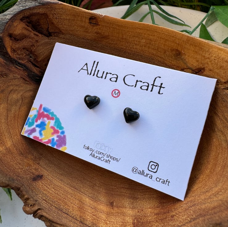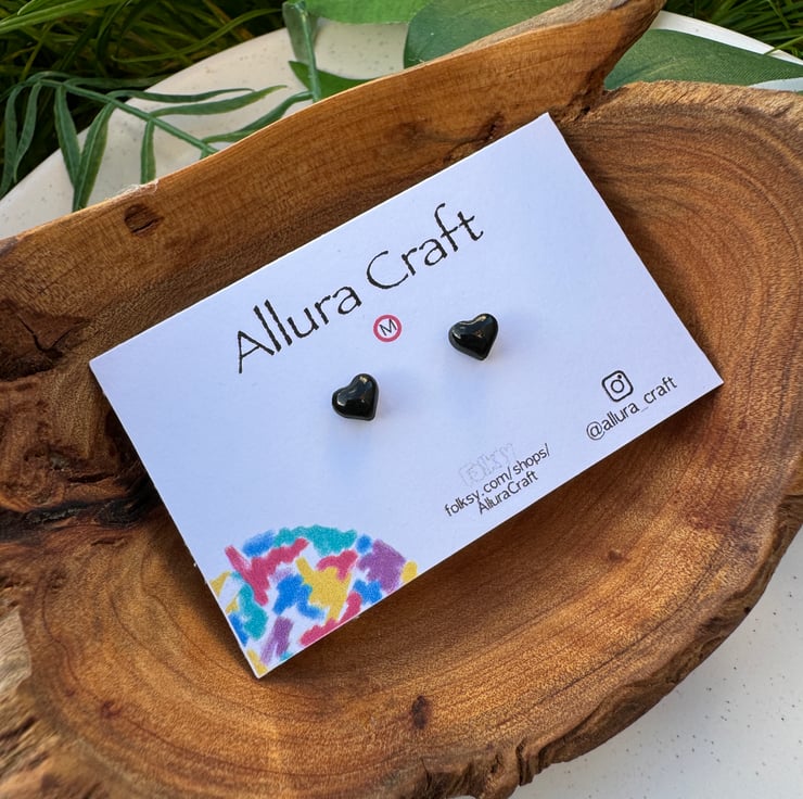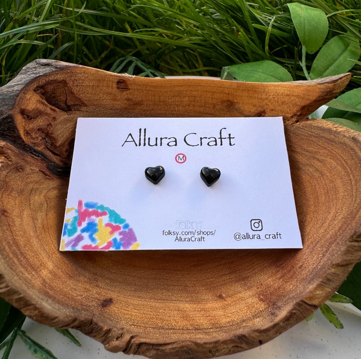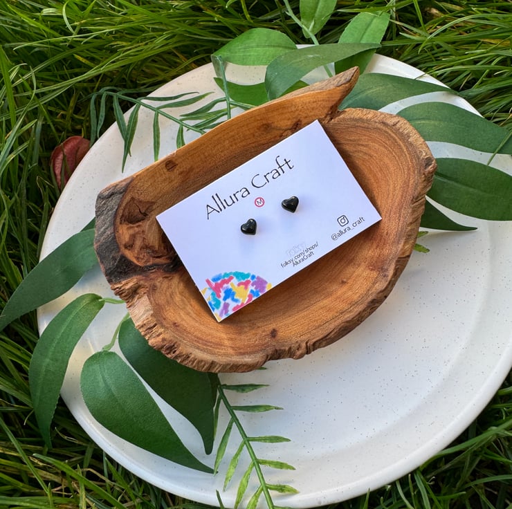 Gloss black tiny micro heart studs.