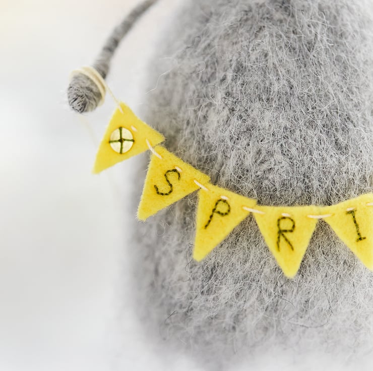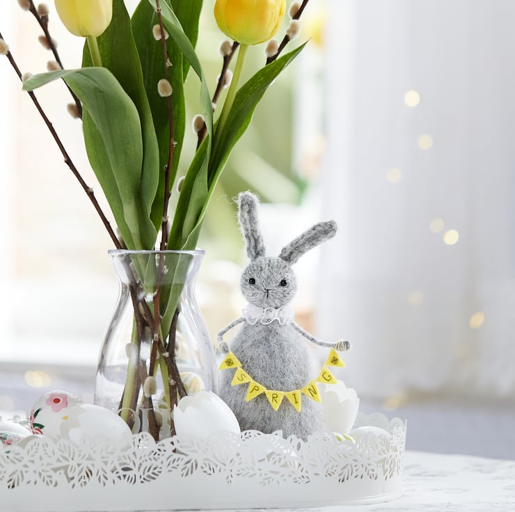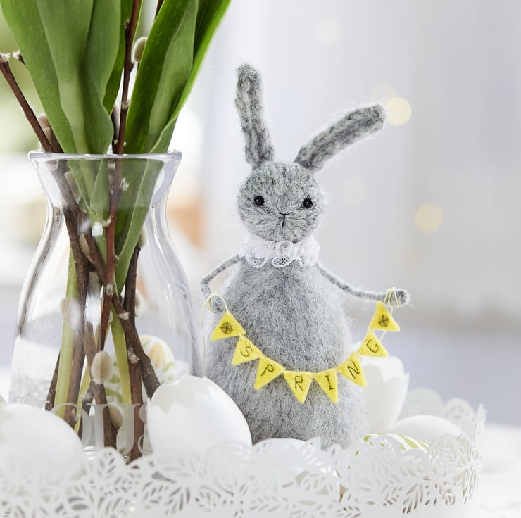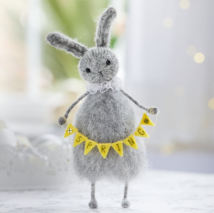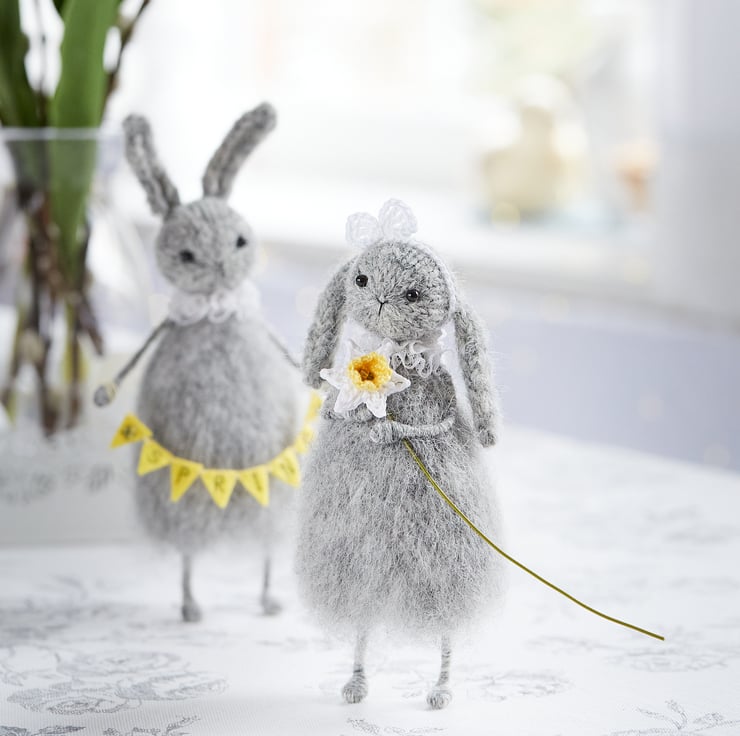 Two little Easter bunnies with a miniature daffodil and a hand stitched bunting that can be personalised with a different word/name/date etc (8 letters maximum please). These two make an adorable seasonal gift and home decoration.