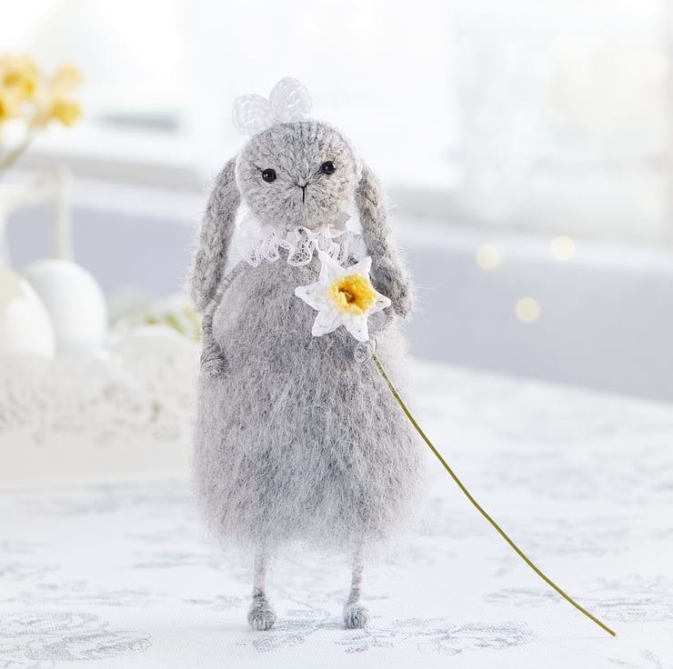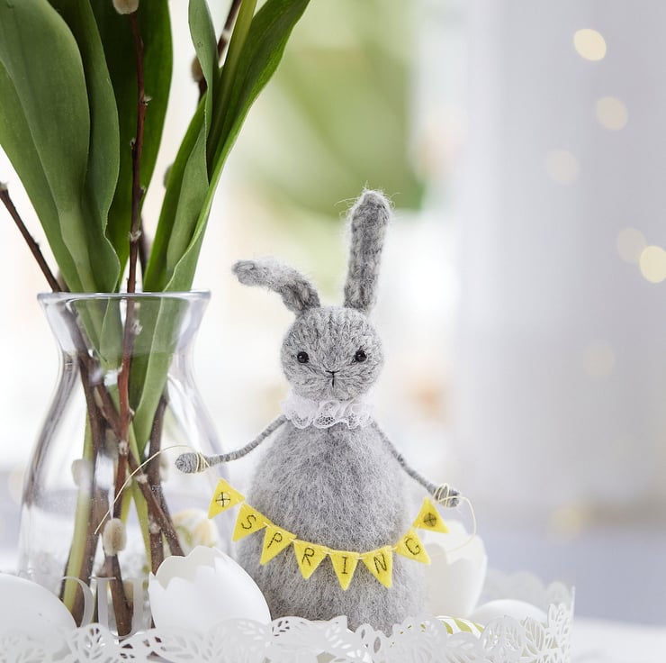 Height appx - 15 cm/6 inches from head to toes (ears not measured), knitted from the finest woollen yarn in grey colour to go well with the spring theme decor. Wire frame inside is to ensure your pets are posable for that extra interest.