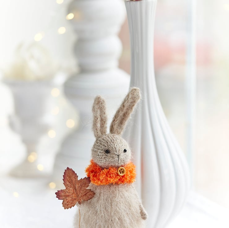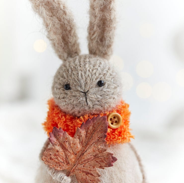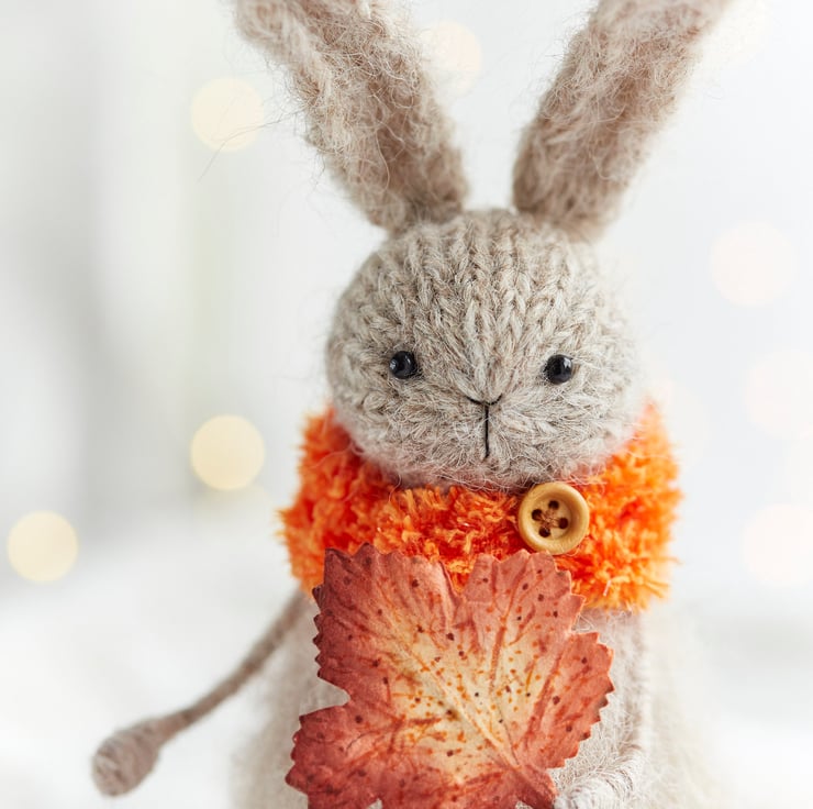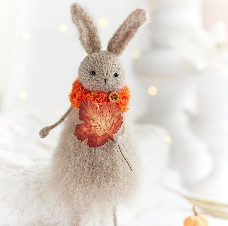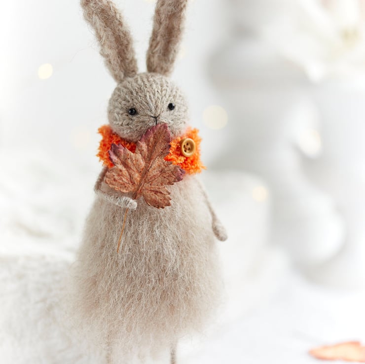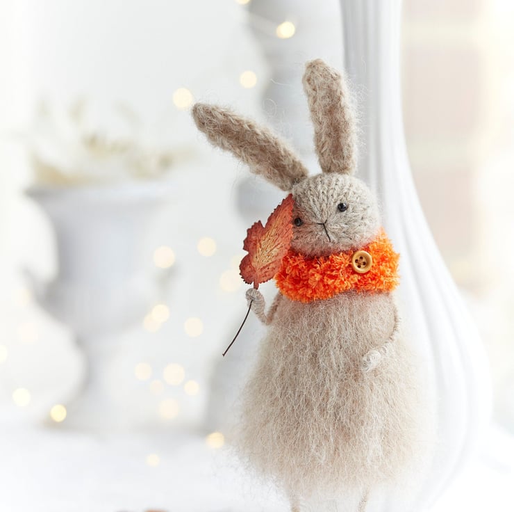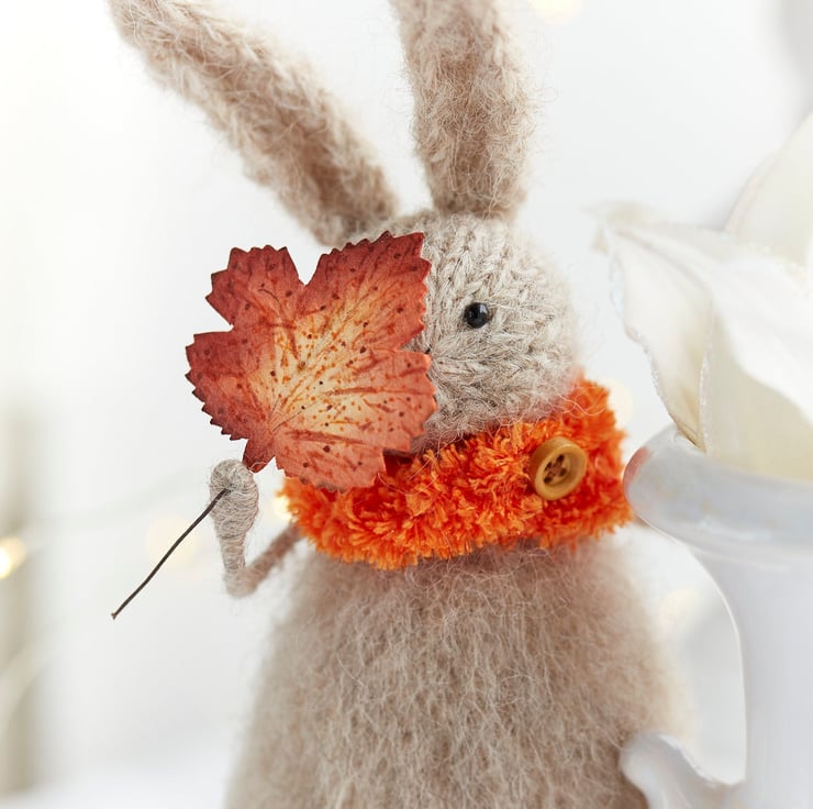 This hand knitted fluffy rabbit is here to celebrate the season of vibrant yet cosy colours. Select either brown or orange leaf colour from the options.